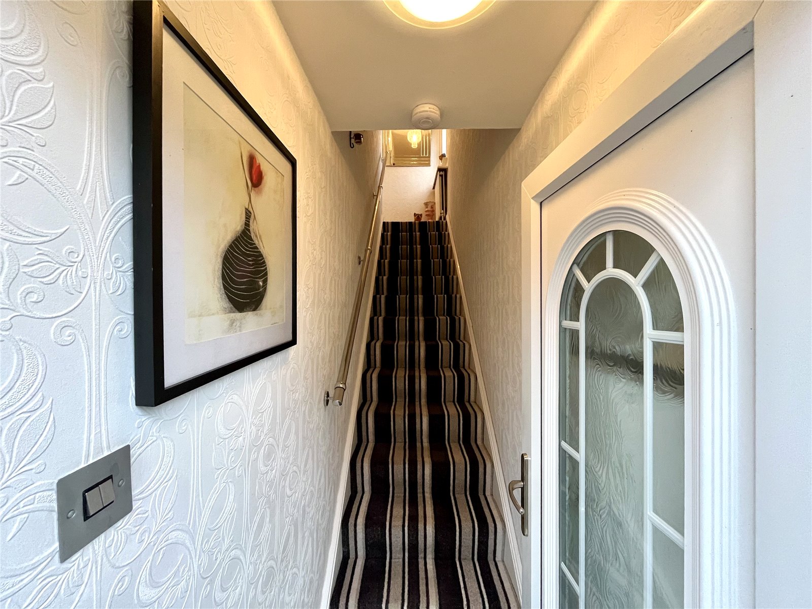 Built-in linen/airing cupboard with shelving which also houses the central heating boiler. Access with pull down loft ladder to partly boarded out storage space. (In a clockwise direction:)