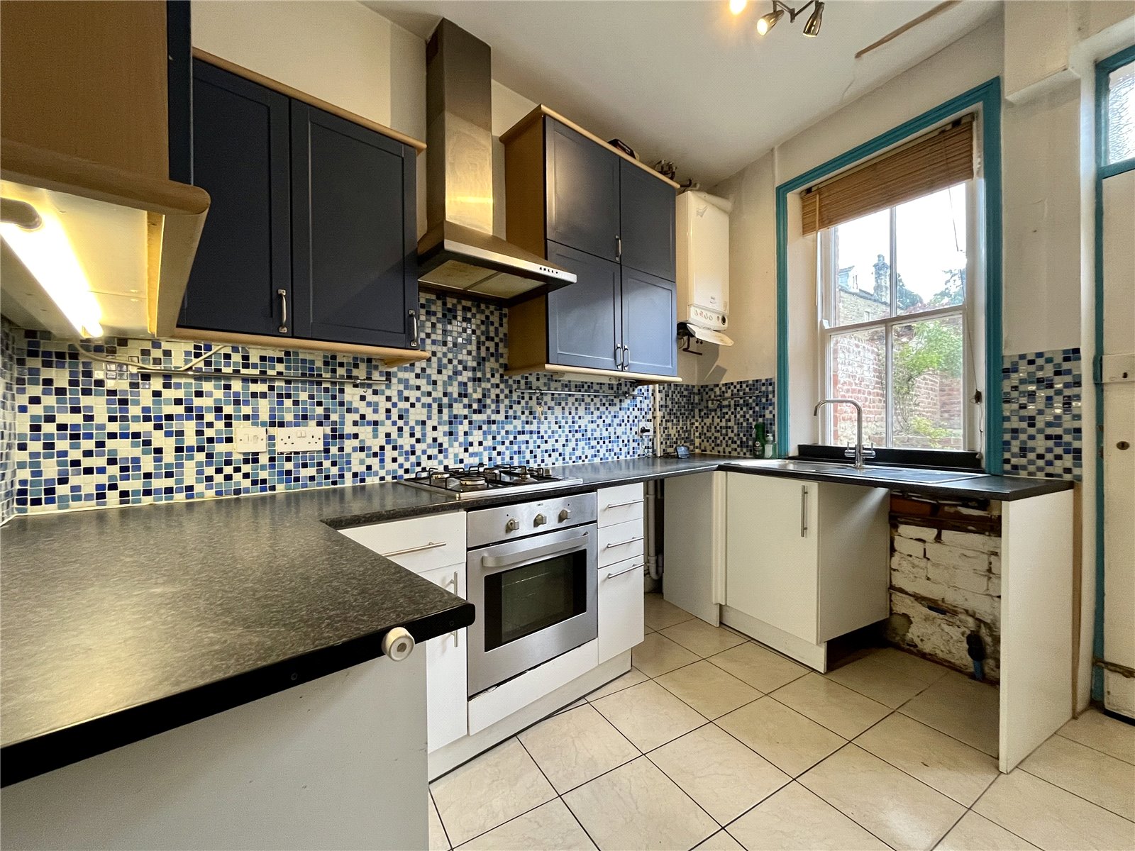(maximum measurement overall) Fitted wall and floor units with worktops over incorporating a stainless steel sink and single drainer with mixer tap over. Four gas hob cooker with extractor hood over and single oven underneath. Tiled splash back and ceramic tiled flooring. Door to garden.