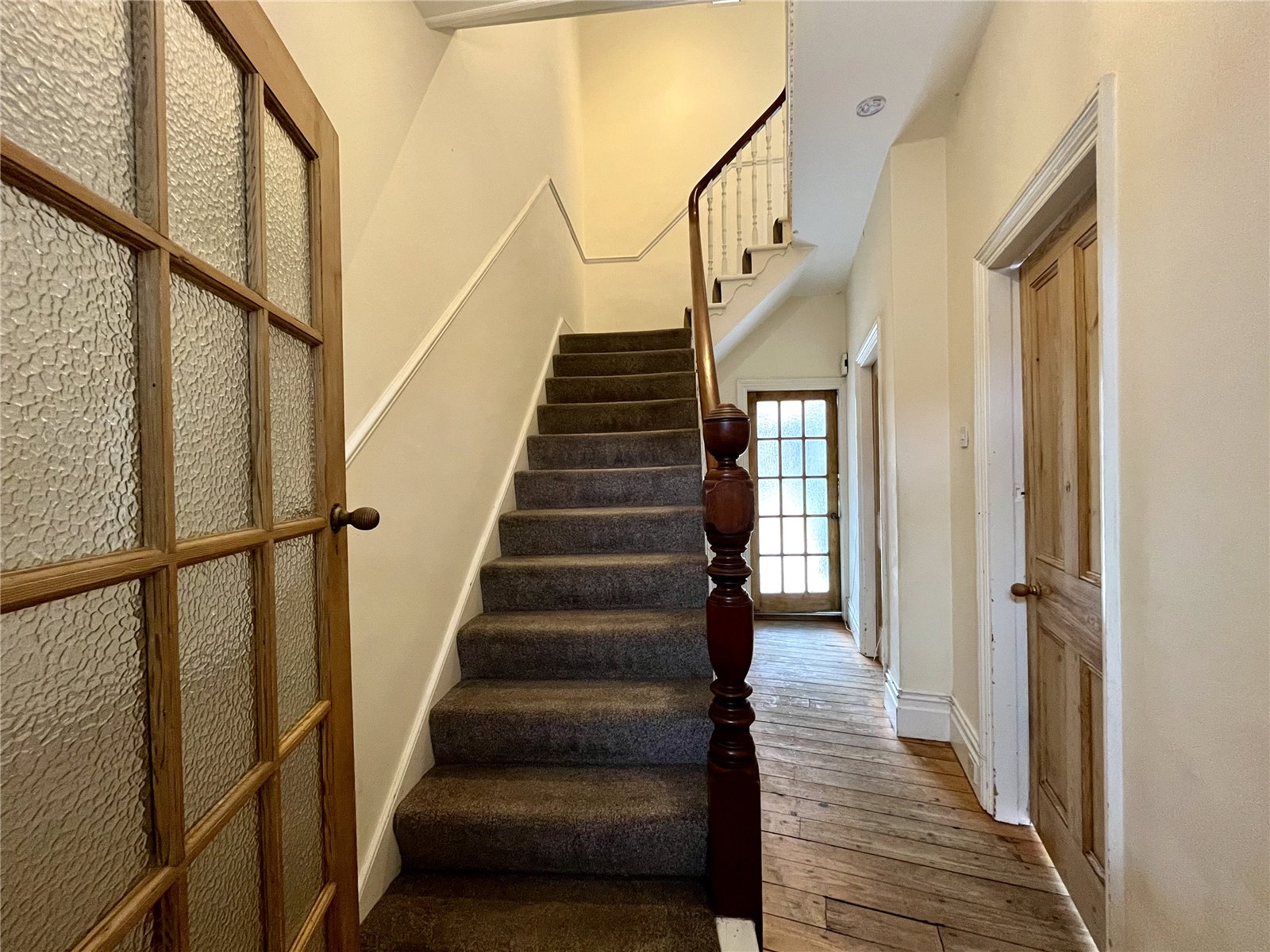 Ornate staircase to first floor with cupboard underneath.