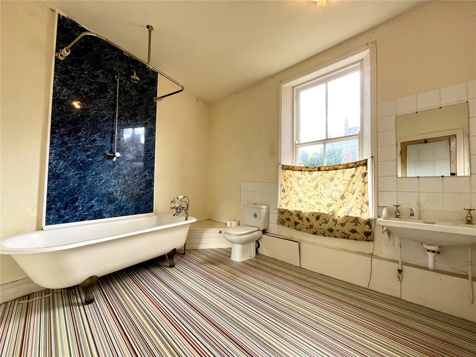 (maximum measurement overall) Roll top cast iron bath with shower over. Wash hand basin and low level WC. Tiled splash back.