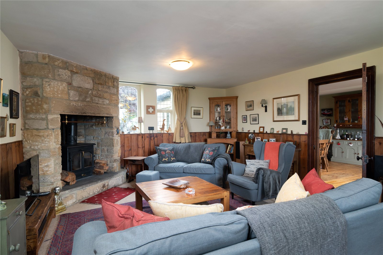 Full of charm and character, with half panelled walls surrounding and arched windows wither end. The main focal point is the impressive stone fireplace and hearth incorporating a multi-fuel burning stove.