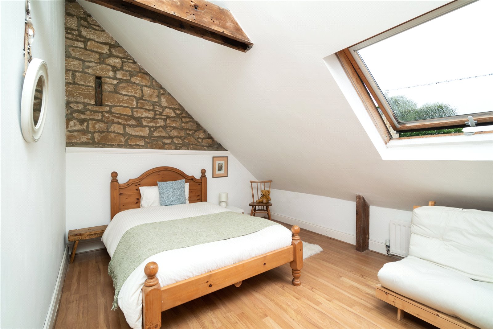 Feature stone wall. Exposed beams. The large drawer and cupboard unit are included in the sale.