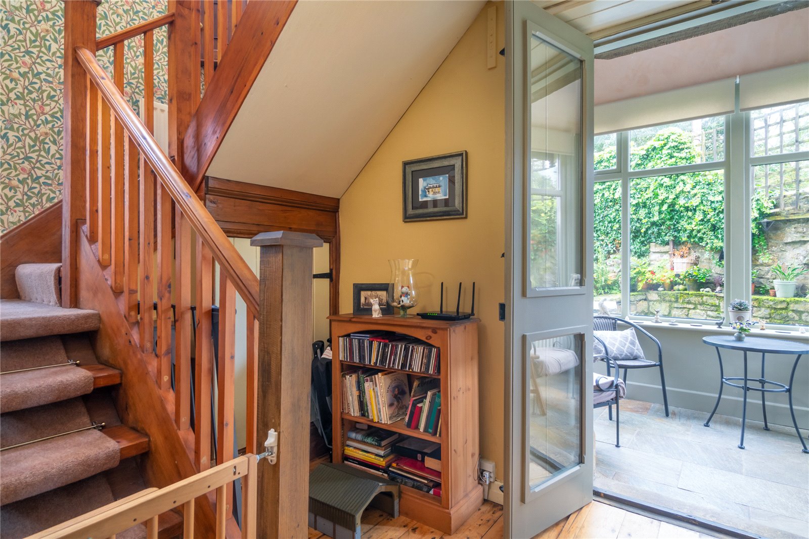 Staircase to first floor with cupboard under. Polished timber flooring.