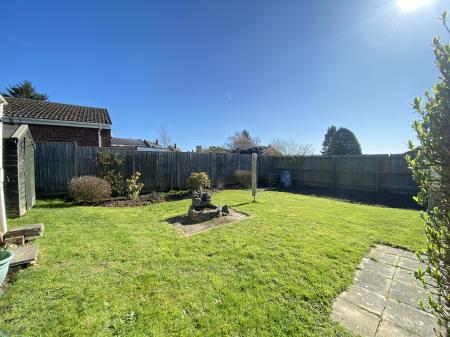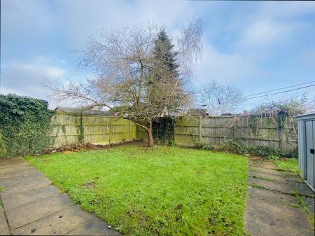 Rear garden, laid to lawn, enclosed by timber fencing and with paved patio and paved path, together with a metal garden shed.