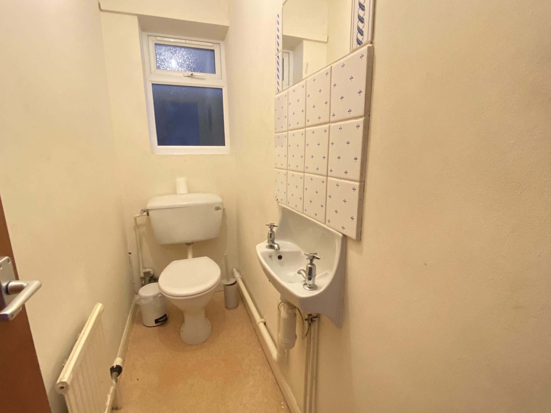 Cloakroom 7' 4" x 2' 8" (2.24m x 0.81m) White 2 piece suite comprising low level wc and wall mounted hand basin with tiled splashback.