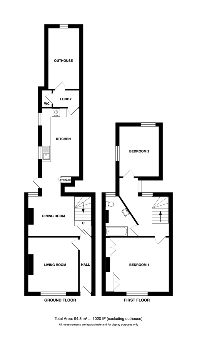 Inside, the surprisingly spacious accommodation includes a welcoming entrance hall, a generous sitting room featuring a sash window, internal shutters, and an open fireplace, separate dining room and a well-designed kitchen/breakfast room with a pantry and downstairs WC. Upstairs, a light-filled landing leads to two double bedrooms and a well-appointed bathroom. The property also benefits from a modern gas central heating system.