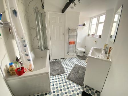 Bathroom 9' 6" deep x 5' 4" average (2.9m x 1.63m) Contemporary three-piece suite comprising panelled bath with marble effect splashback, glazed screen and chrome shower attachment, low level wc, vanity hand wash basin, fitted vinyl flooring, built-in cupboard housing combi gas fired boiler, chrome ladder radiator.