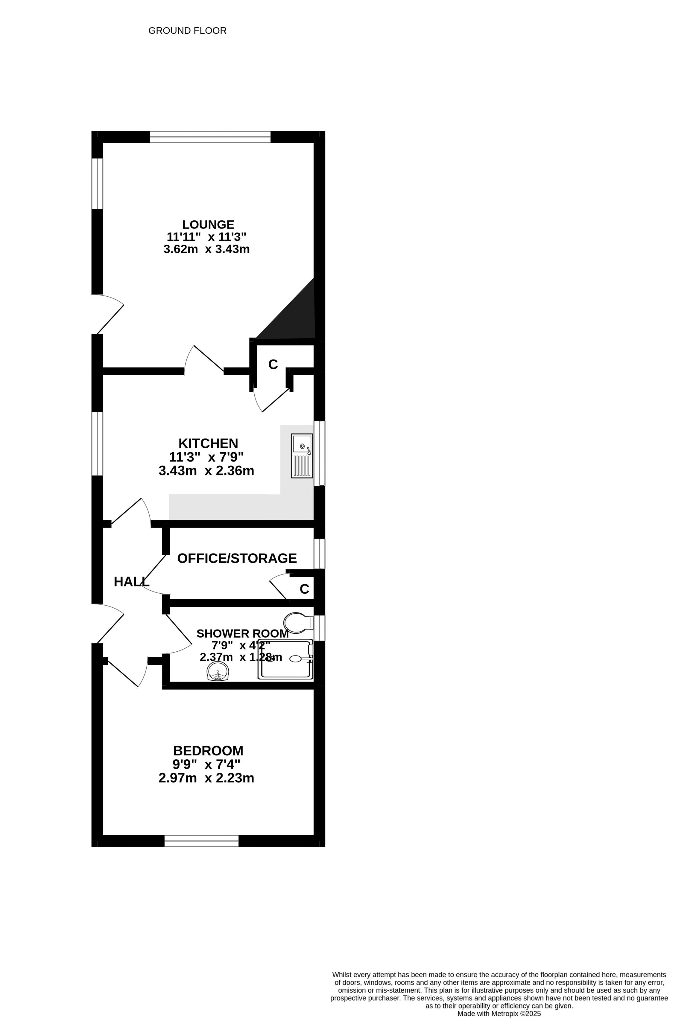 The accommodation comprises an entrance hallway with access to all rooms. To the rear of the property is a well-proportioned double bedroom with a range of fitted wardrobes providing ample storage. Adjacent to the bedroom is a shower room featuring a three piece suite including a shower cubicle, low level WC, and hand wash basin. There is also a useful office or storage room with an additional built-in cupboard.