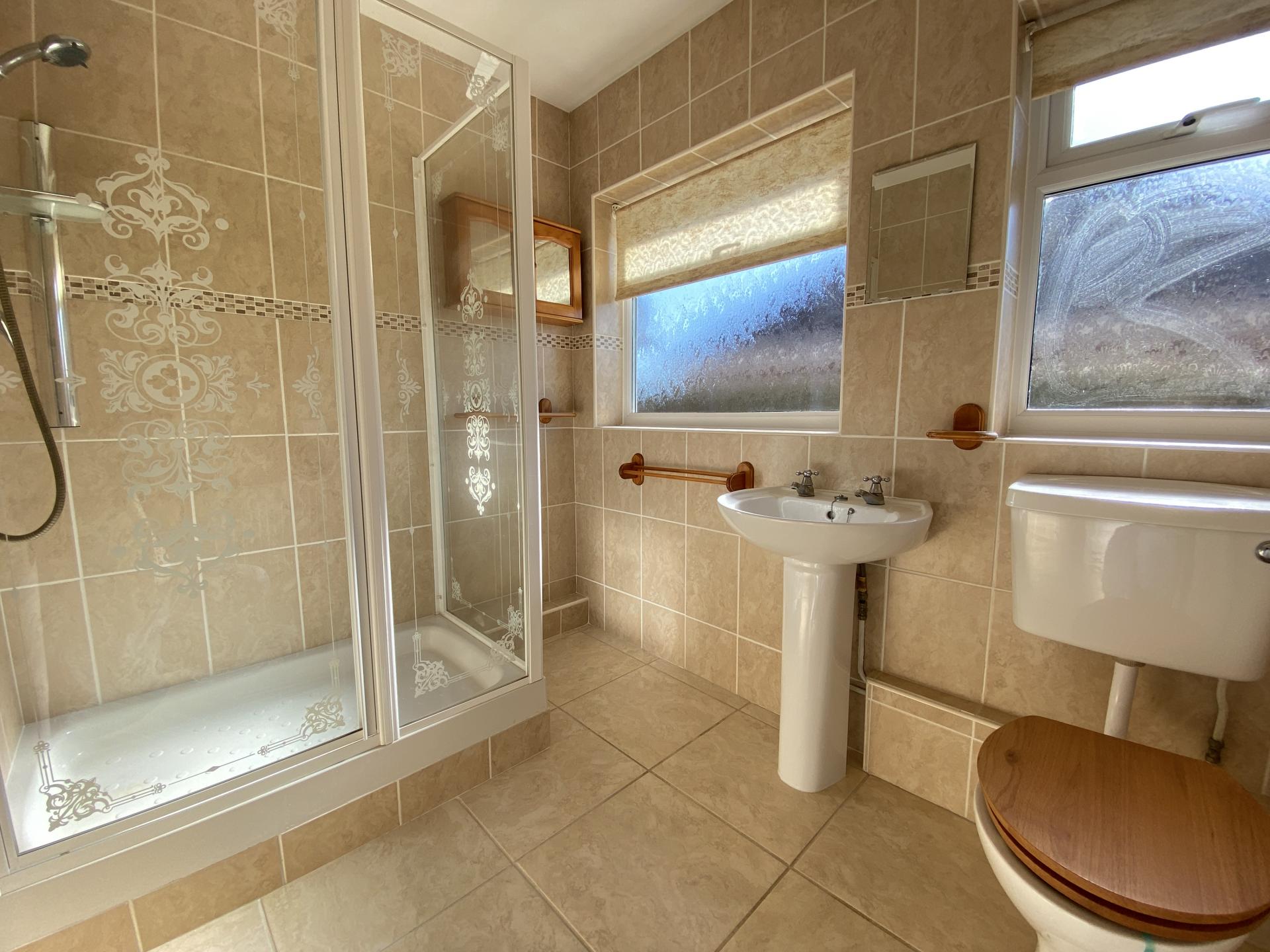 Shower Room 7' 11" x 6' 1" (2.41m x 1.85m) White 3 piece suite comprising large shower cubicle, pedestal wash basin and low level wc, inset ceiling lights, radiator, ceramic tiled floor