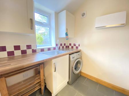 Utility Room 6' 9" x 6' (2.06m x 1.83m) Stainless steel single drainer sink unit inset to laminate worktop, fitted base unit and matching wall cupboards, plumbing for automatic washing machine, ceramic tiled floor, chrome ladder radiator, built-in cloaks cupbaord.