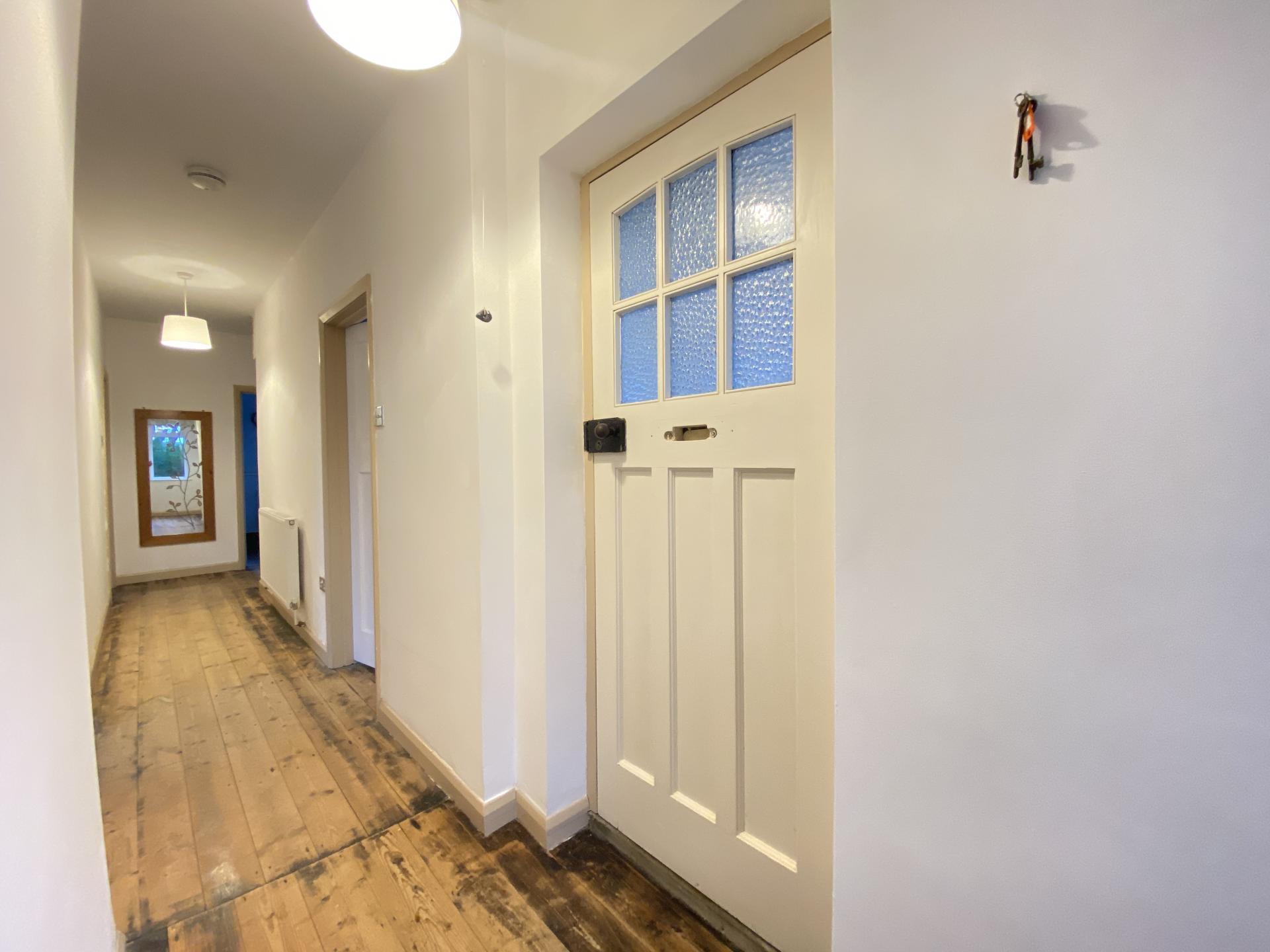 Hall 26' 2" x 3' 4" (7.98m x 1.02m) Boarded floor, radiator, uPVC sealed unit double glazed window, and part glazed door to the enclosed front VERANDAH with uPVC sealed unit double glazed windows and door opening to the garden.