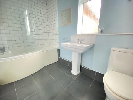 Bathroom 9' 4" x 5' 5" (2.84m x 1.65m) White 3 piece suite comprising P shaped bath with Chrome mixer tap, shower attachment & glazed screen, pedestal wash basin, low level wc, ceramic tiled floor, extractor fan, radiator, electric fan heater, uPVC sealed unit double glazed window.