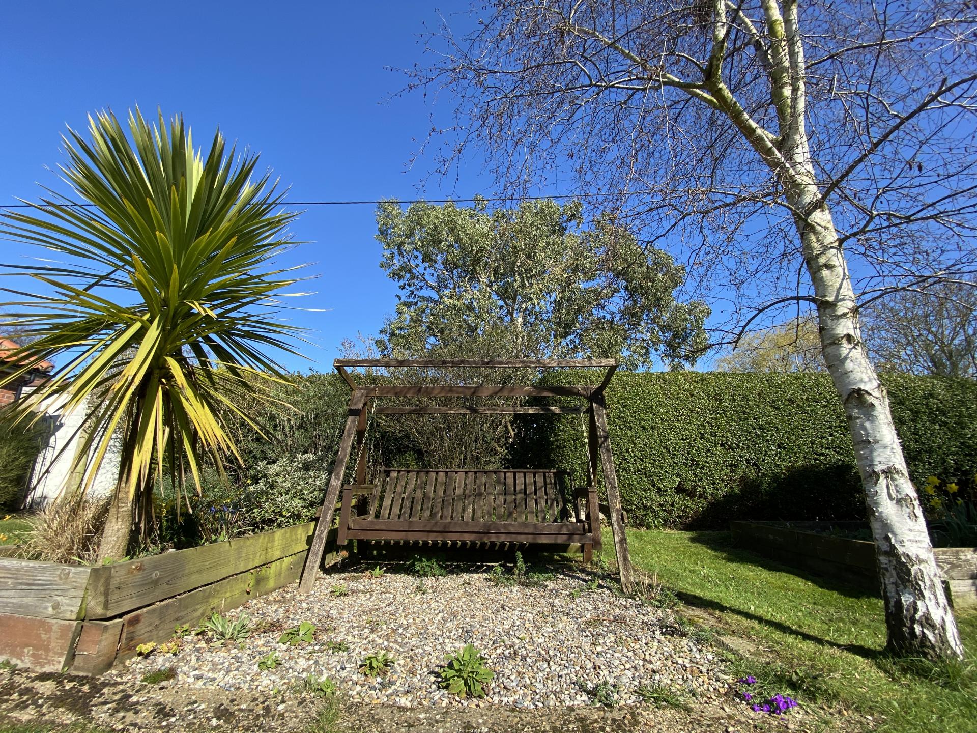 The rear gardens have a sheltered patio area adjacent to the living room, with expensive lawns beyond, screened by mature hedging and raised veg beds and planters.