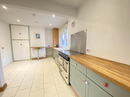 Kitchen 10' 11" x 3.33m) Glazed 1.5 bowl sink unit inset to solid wood worktops, chantry green fronted fitted units, range style cooker with lpg gas hob electric hotplate and multiple oven/grills, built-in cupboard housing lpg gas fired boiler, built-in shelved cupboard to alcove, plumbing for dishwasher, ceramic tiled floor, inset ceiling lights, uPVC sealed unit double glazed window, door to: