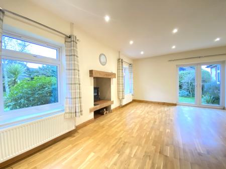 Living Room 19' 7" x 16' (5.97m x 4.88m) narrowing to 9'5" A large L'shaped space with twin sealed unit double glazed windows overlooking the rear garden and double glazed french doors opening to a sheltered patio area, engineered oak floor, recessed fire place with raised tiled hearth, log niche beneath and wood burning stove, inset ceiling lights, open plan to: