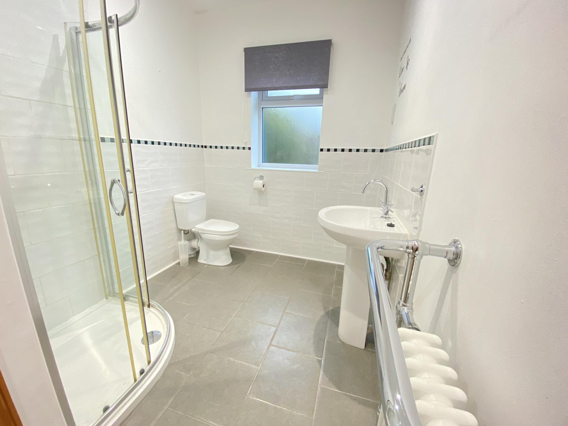 Shower Room 6' 7" x 12' 9" (2.01m x 3.89m) maximum White 3 piece suite comprising quadrant corner shower with chrome mixer shower, low level wc and pedestal wash basin, part ceramic tiled walls, inset ceiling lights, sealed unit double glazed window, ceramic tiled floor, large built-in cupboard housing lagged hot water tank and slatted shelving.
