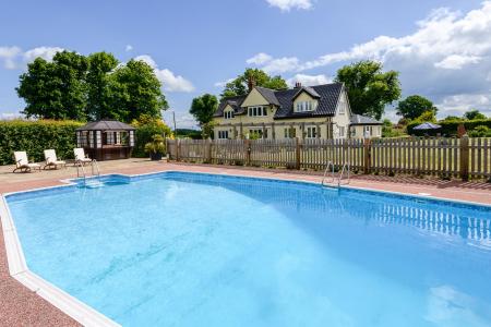 Outside the property is approached via gates onto a sweeping gravelled drive that passes the well-established pond and leads to a parking area for several cars. To the side there is an open store and an area where planning consent has been granted for a detached cart lodge. The grounds extend to approximately 7 acres (sts) and comprise a well-landscaped formal garden that is mainly laid to lawn with a variety of mature shrub borders, sandstone pathways with a pergola and a well-appointed sandstone terrace, perfect for entertaining. Across from the formal garden there is an electrically heated swimming pool with a further paved terrace and entertaining area. Beyond the formal garden there are meadows/paddocks with mature boundary hedging.
