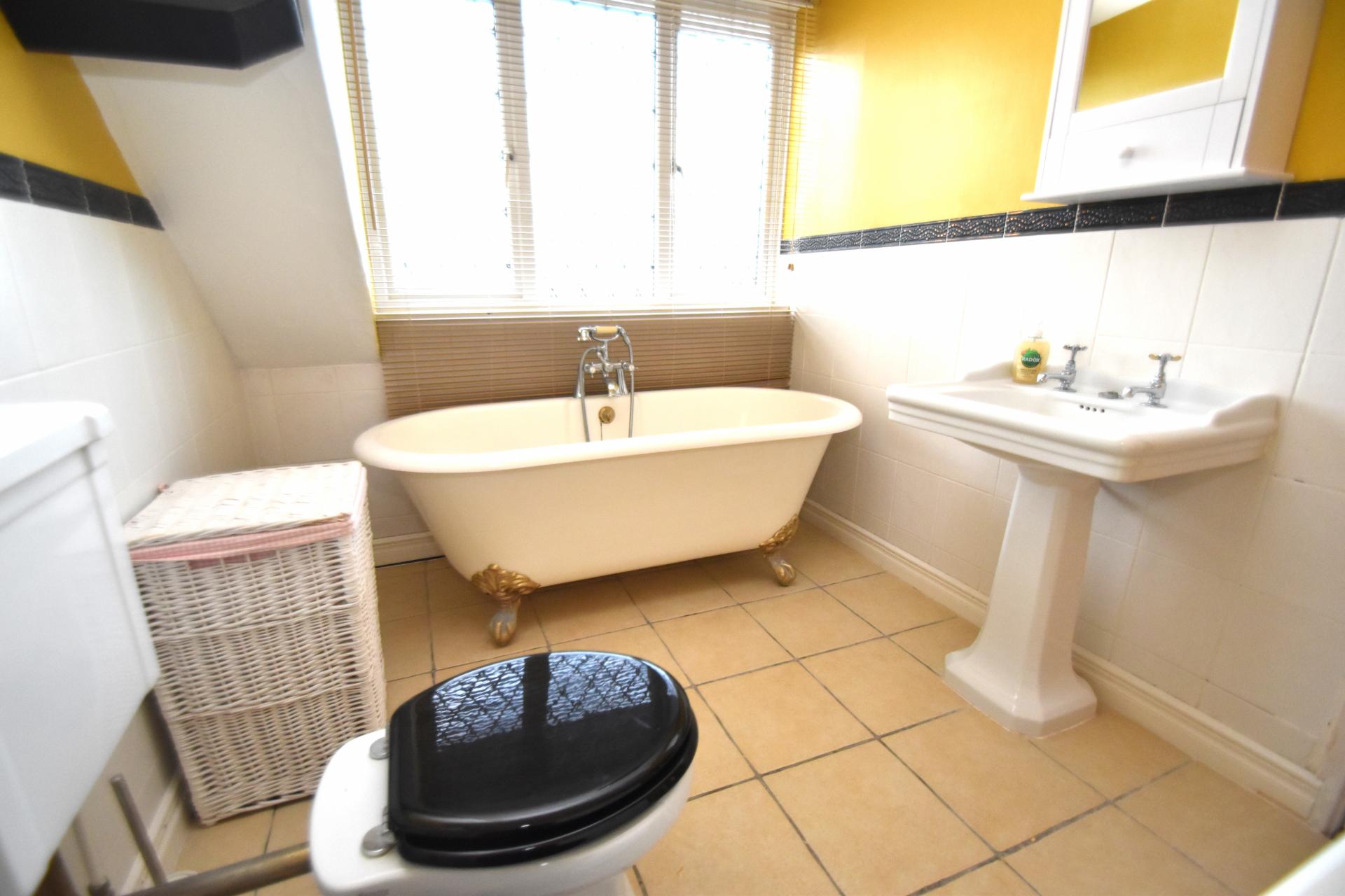 En-Suite Bathroom 9' 7" x 1' 0" (2.92m x 0.3m) (Side Aspect) 9' 0" x 7' 1" (2.74m x 2.16m) Victorian style suite comprising freestanding roll top bath with mixer tap and shower attachment, low level W.C., pedestal hand basin, wall mounted vanity cupboard, tiled floor, ladder radiator, sea views.
