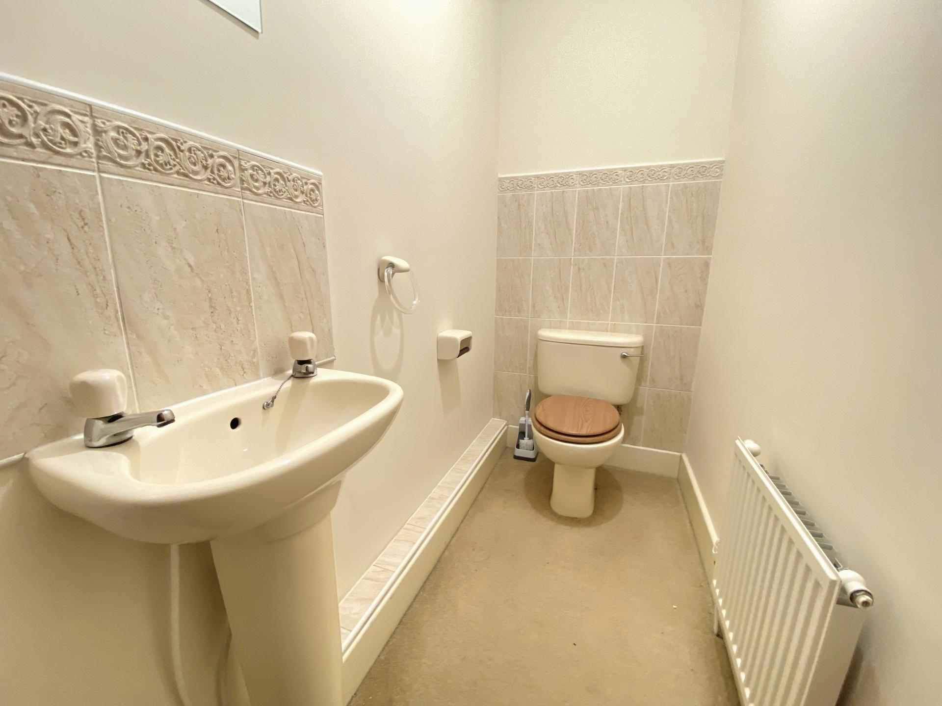 En-Suite Shower Room White three piece suite comprising tiled corner shower cubicle with glazed screen and mixer shower, low level WC and pedestal wash basin, shaver point, coved ceiling, extractor fan, vinyl flooring.