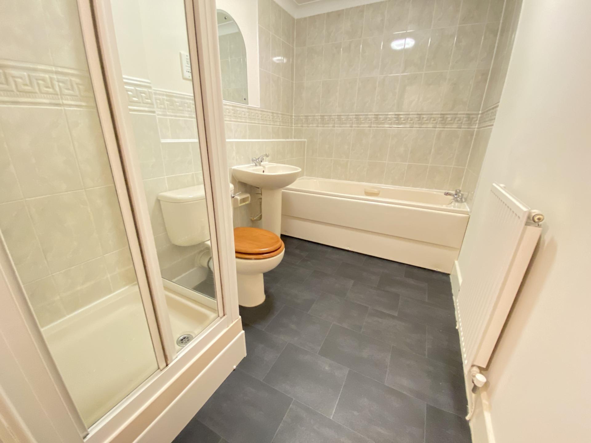 Bathroom 9' 3" x 5' 6" (2.82m x 1.68m) Four piece suite comprising twin grip panelled bath with mixer tap, shower attachment and concertina glazed screen, pedestal wash basin with mixer tap and pop-up waste, low level WC, tiled corner shower cubicle with glazed screen, radiator, shaver point, coved ceiling, extractor fan, vinyl flooring.