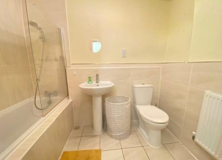 Bathroom 8' 1" x 5' 7" (2.46m x 1.7m) including plinth White 3 piece suite comprising panelled bath with tiled surround, mixer tap and shower attachment, pedestal wash basin, low level wc, ceramic tiled floor radiator.