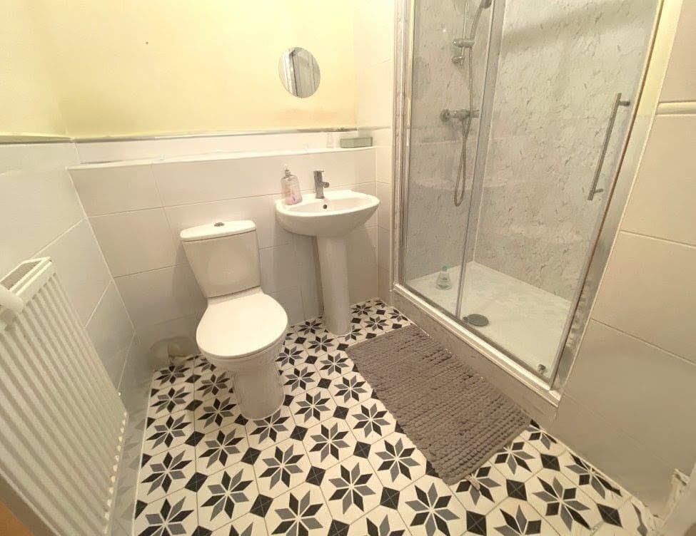 En-Suite Shower Room 7' 7" x 6' 6" (2.31m x 1.98m) White 3 piece suite comprising double shower cubicle with marble effect splashback, pedestal wash basin, pedestal wash basin and low level wc, part ceramic tiled walls, extractor fan.