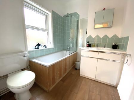 Bathroom 7' 11" x 6' 5" (2.41m x 1.96m) White 2 piece suite comprising panelled bath with tiled surround, glazed screen and mixer shower over, low level wc and wash basin with cupboard beneath.