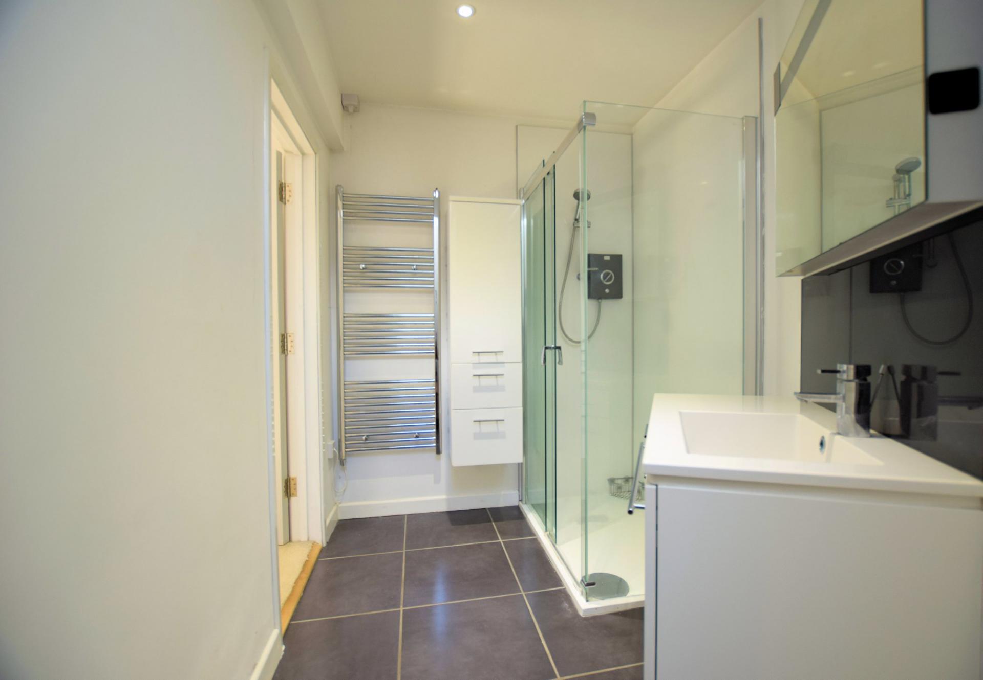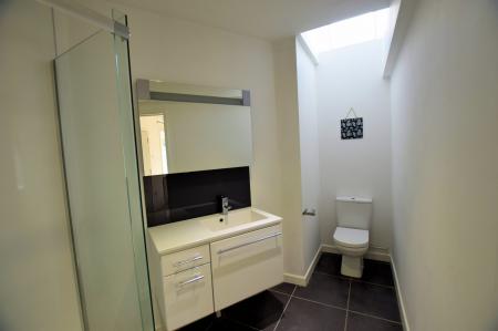 EN-SUITE SHOWER ROOM Three piece suite comprising low-level WC, wash hand basin set into vanity unit and glass shower cubicle with electric shower. Electric velux window, wall mounted vanity unit, heated towel rail, tiled flooring and underfloor heating.