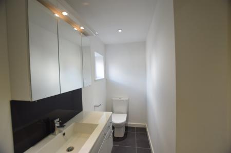 CLOAKROOM Two piece suite comprising low-level WC and wash hand basin set into vanity unit.Obscure window to side aspect, radiator, tiled flooring and extractor fan. Space and plumbing for washing machine and tumble dryer.