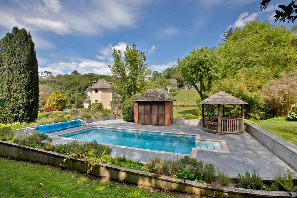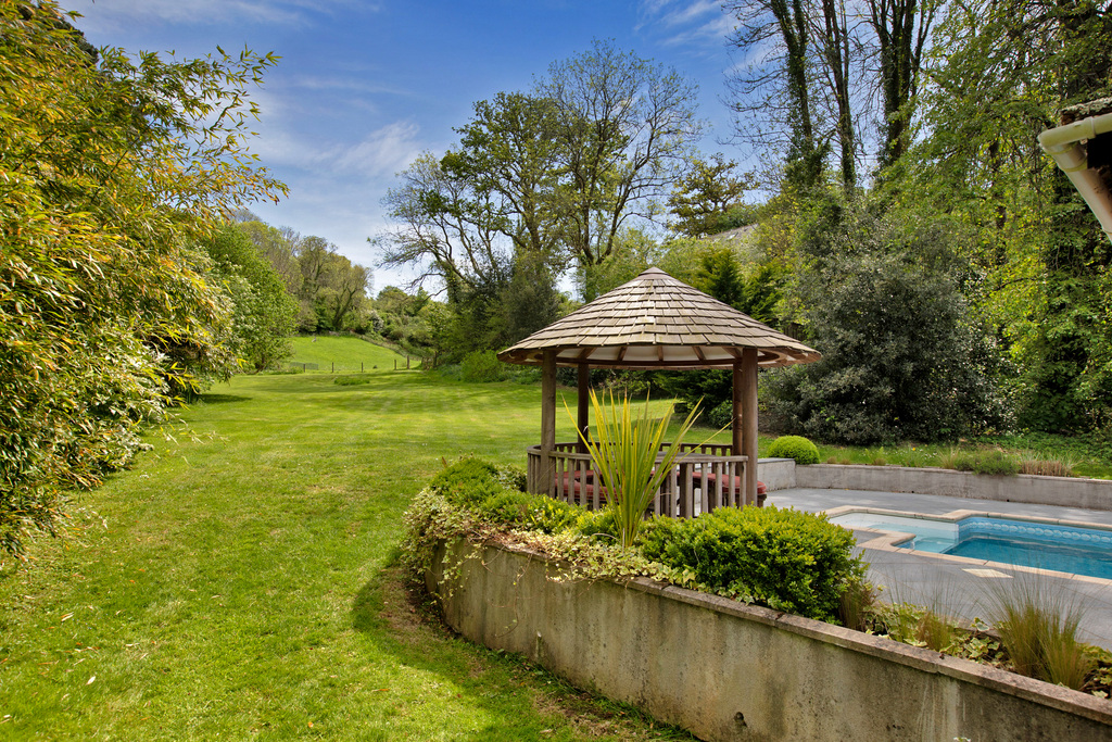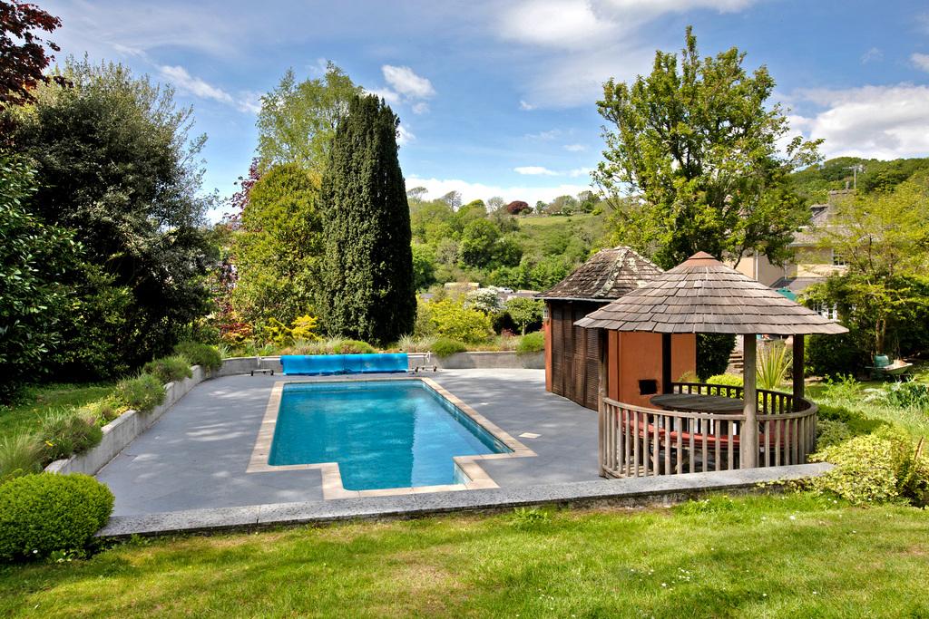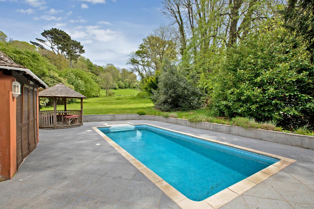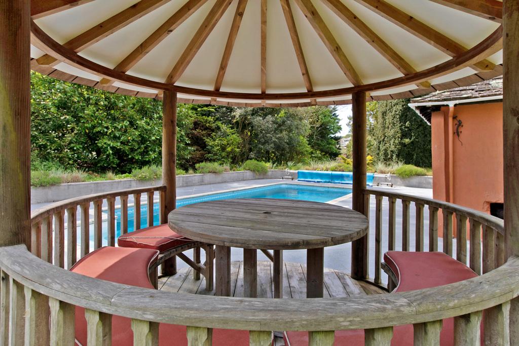 - Outdoor Living: Stone terrace with pergola, swimming pool, gazebo, and changing/plant room.