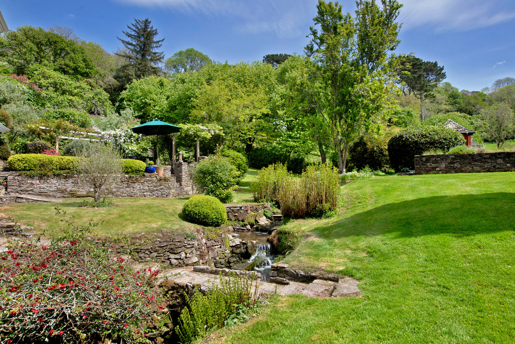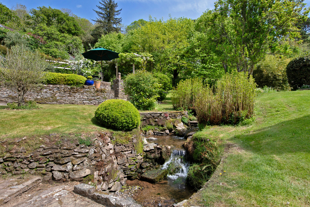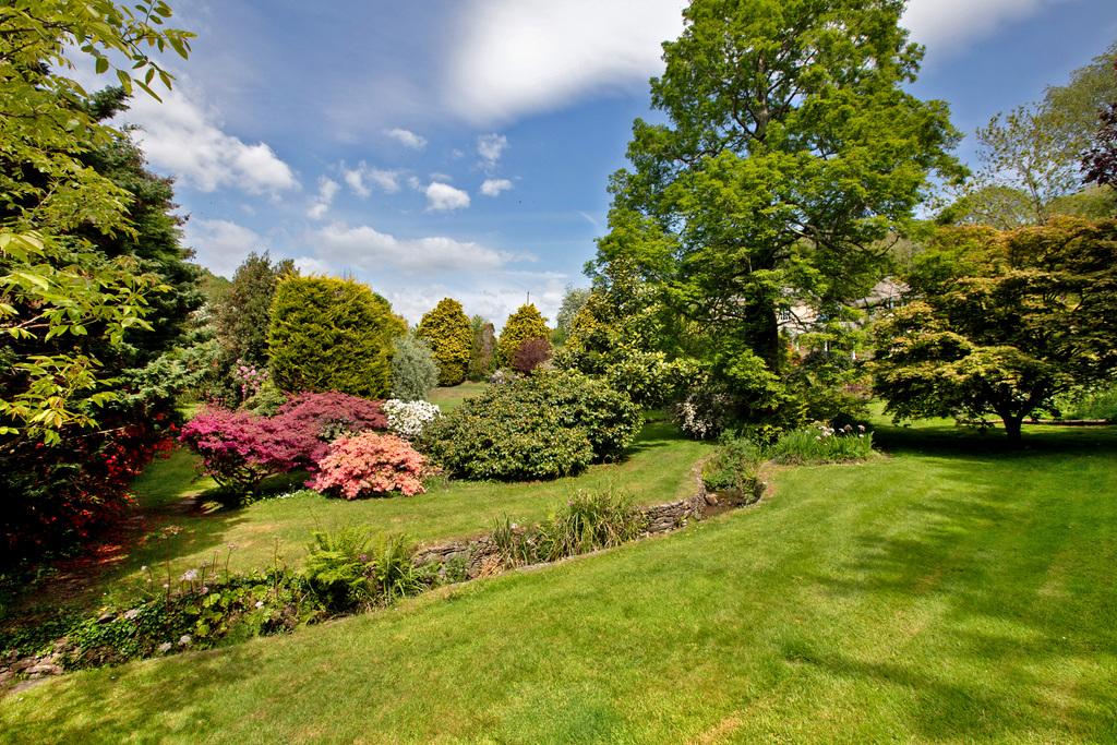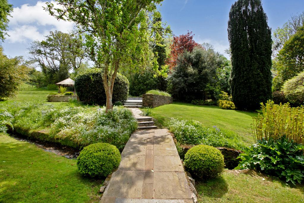 - Beautiful Gardens: Sweeping lawns, mature trees, stream with footbridge, greenhouse, and barn with loft.