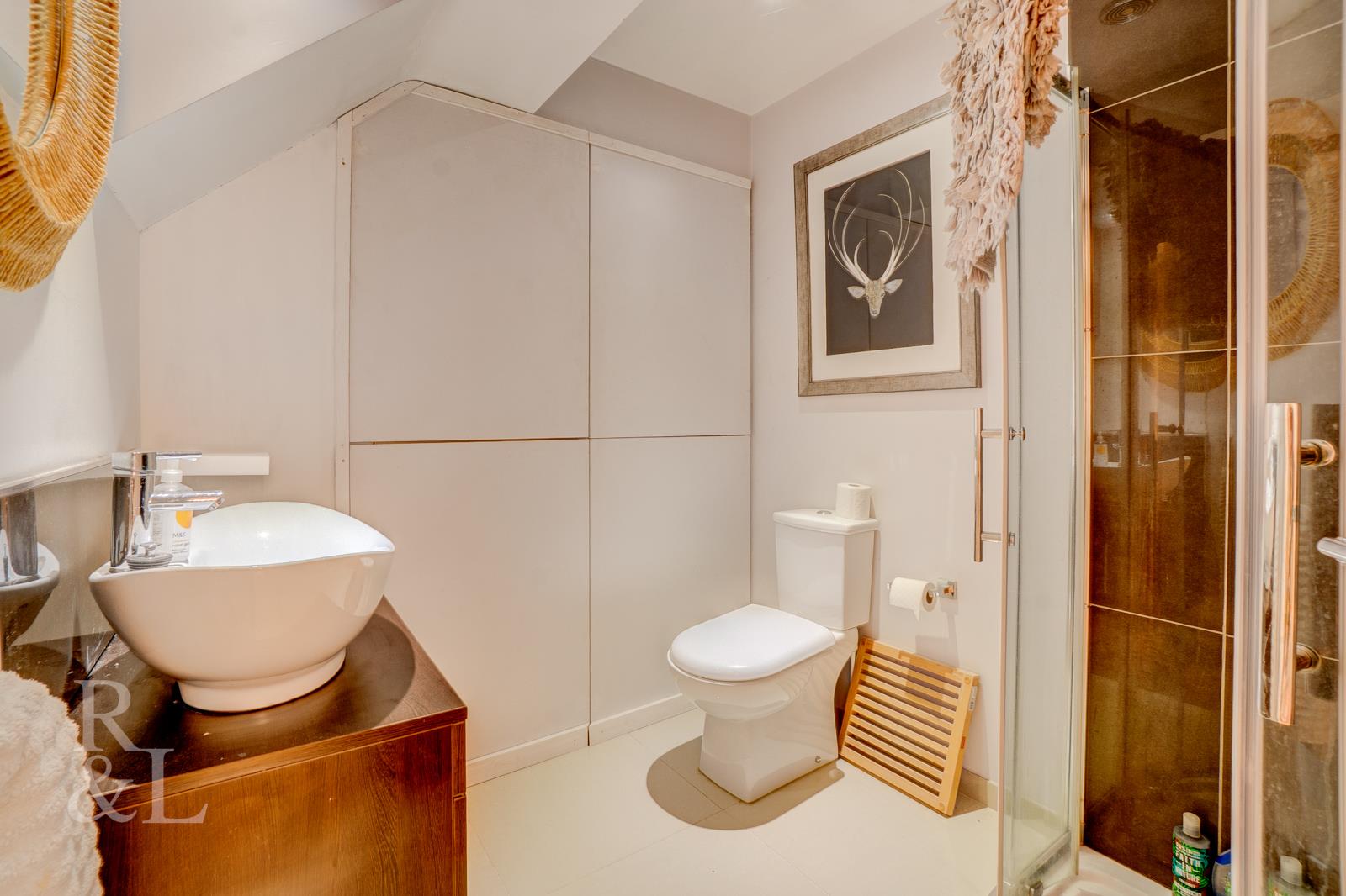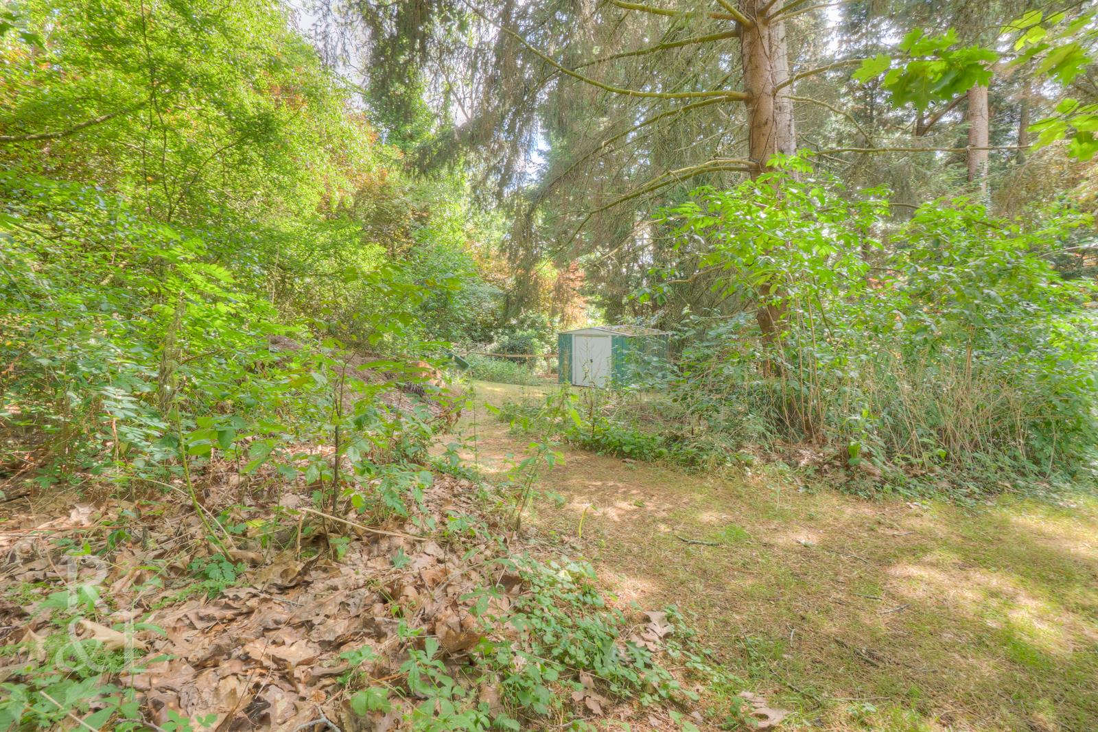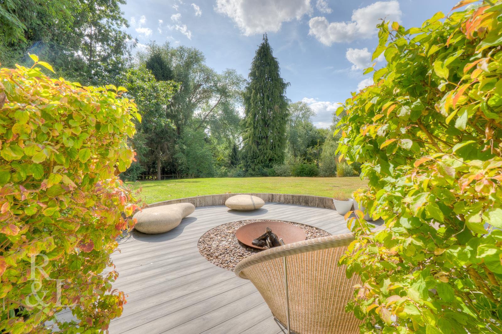 To the rear of the property, a detached garden room is currently used as a home gym but would make an equally nice office or studio space. A patio runs the full width of the plot providing outdoor seating looking down the garden leading to a sunken fire pit area. The remainder of the plot is mainly laid to lawn bordered with a selection of trees, shrubs and bushes with a lovely woodland area to the left hand side.