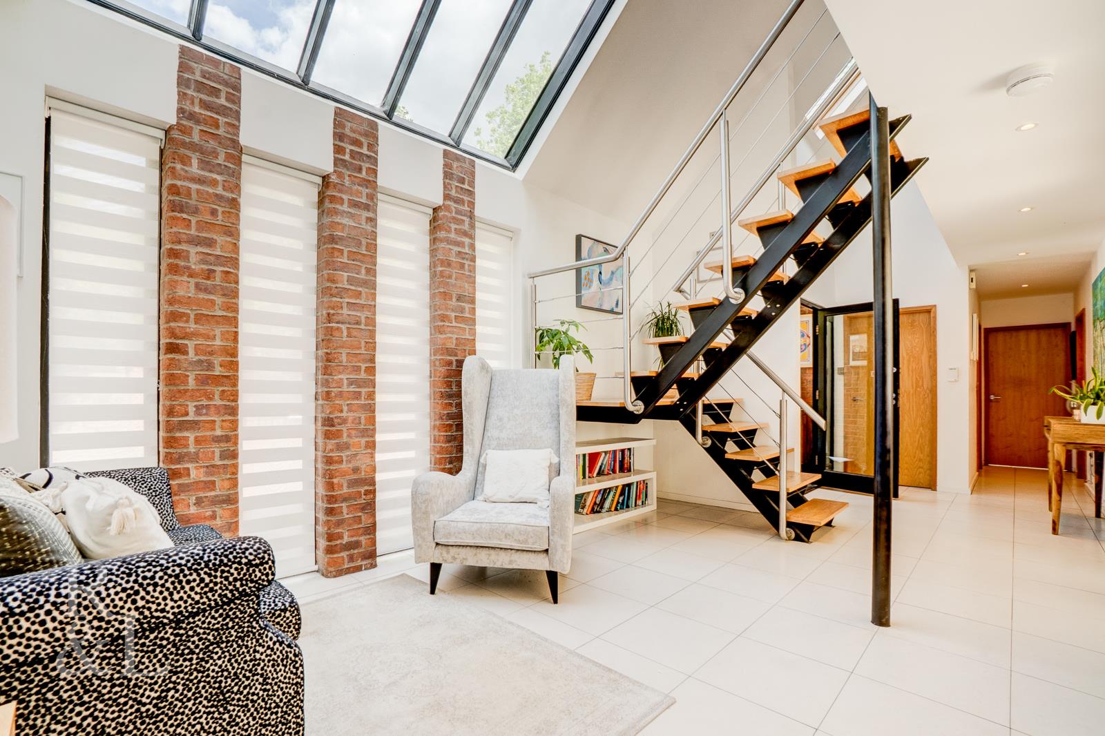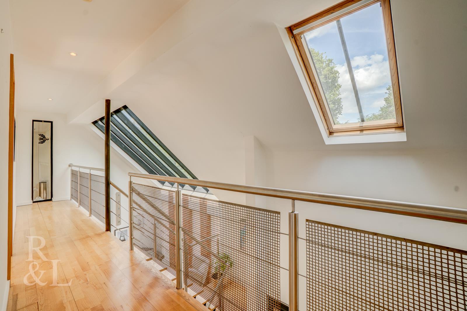 Internal accommodation comprises a welcoming entrance hallway which benefits from a galleried landing above with four floor-to-ceiling glass panelled windows and a feature skylight allowing the area to flood with natural light. Off to the right of the entrance hall there is an open plan kitchen/diner which leads round to one of the reception rooms with full width bi-fold doors opening to the rear garden. Off the kitchen area there is a separate utility room and a separate formal dual aspect reception room with a vaulted ceiling and exposed timber trusses which has French Doors opening to the rear garden plus a side window.