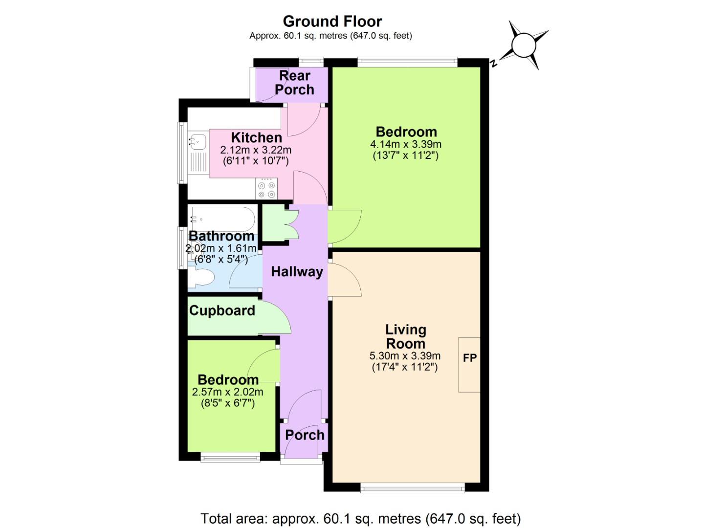 Interior accommodation comprises of a hallway which leads you into the living room, bedrooms, kitchen and bathroom. The living room is a generous size with a front aspect window flooding the room with natural light, pieced together with an electric fireplace. The kitchen is ample in size and has more than enough room to fit freestanding appliances. Off from the kitchen is a rear porch which leads to the driveway and to the rear of the property, where there is a small patio courtyard area..