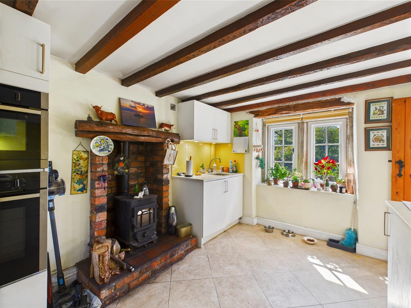 A feature recessed brick fireplace with wooden mantelpiece over incorporating a cast iron log burning stove, beamed ceiling and uPVC sealed unit double glazed stone mullioned windows looking to the front garden. Stairs to first floor.