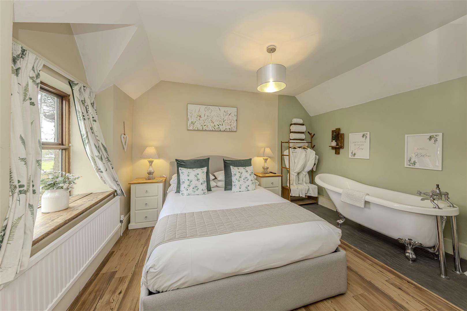 - Dreamy primary bedroom with roll-top bath and serene outlooks