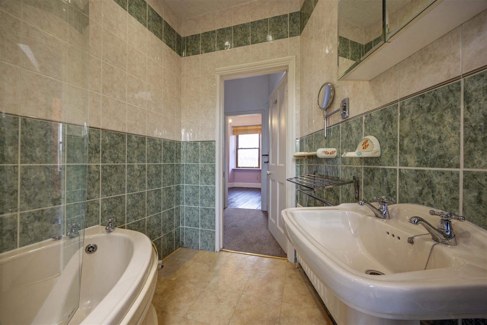 Bathroom - Tiled flooring, radiator, wash basin, toilet, corner bath with shower over, wall mounted vanity unit, extractor fan, double glazed window with textured glass to rear aspect.