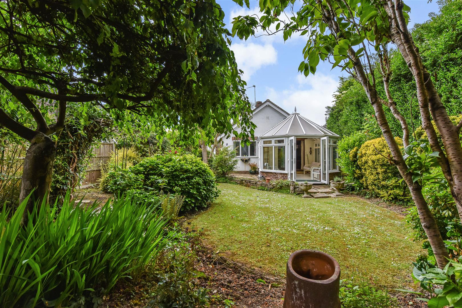The rear garden has a lawn area and there are several mature trees and shrubs giving a park like feel.