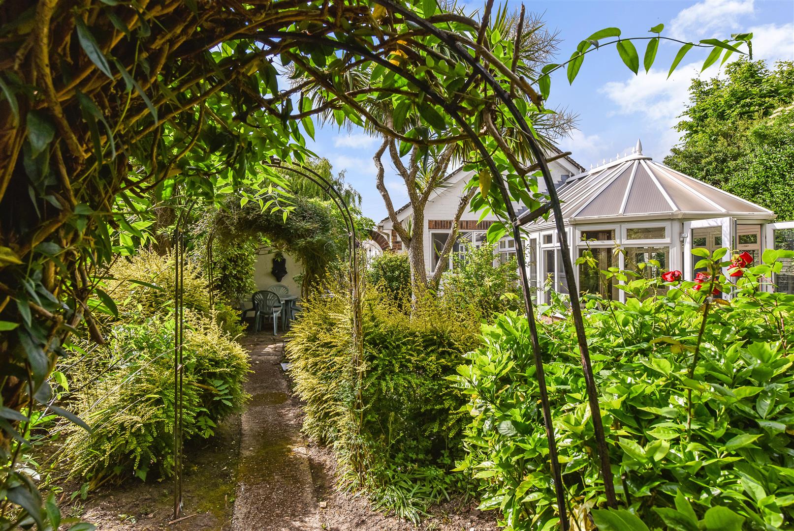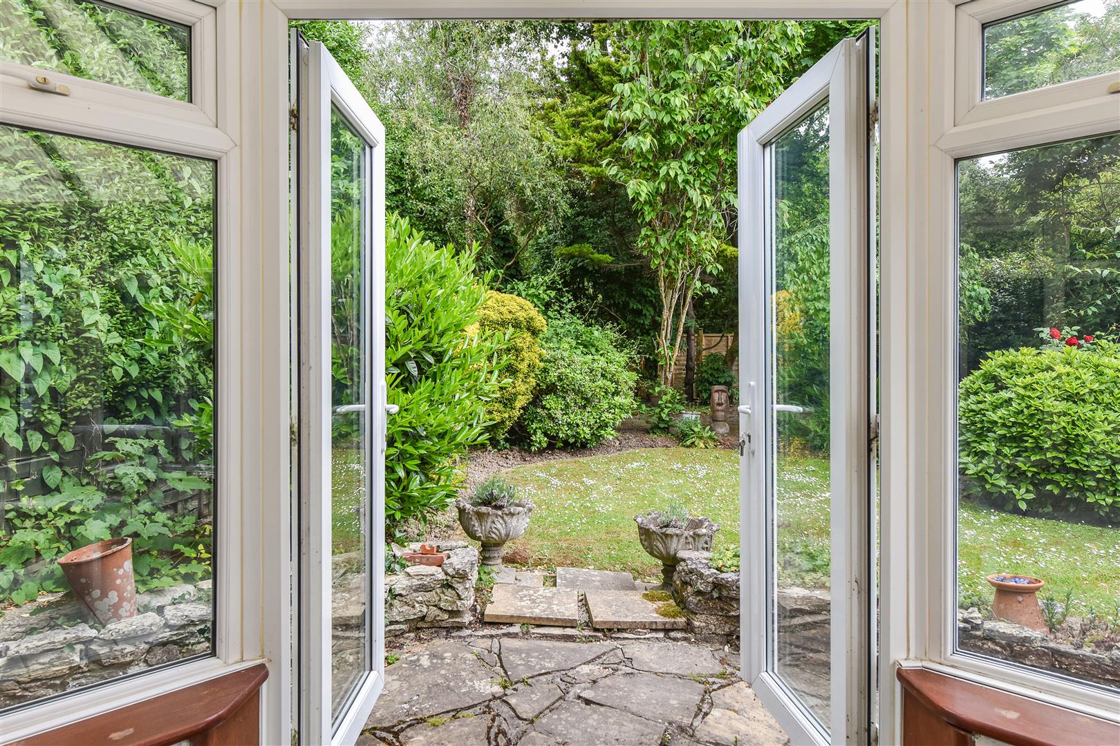 Conservatory: (SE) Vaulted ceiling. Two sets of double doors leading out to a pretty garden.