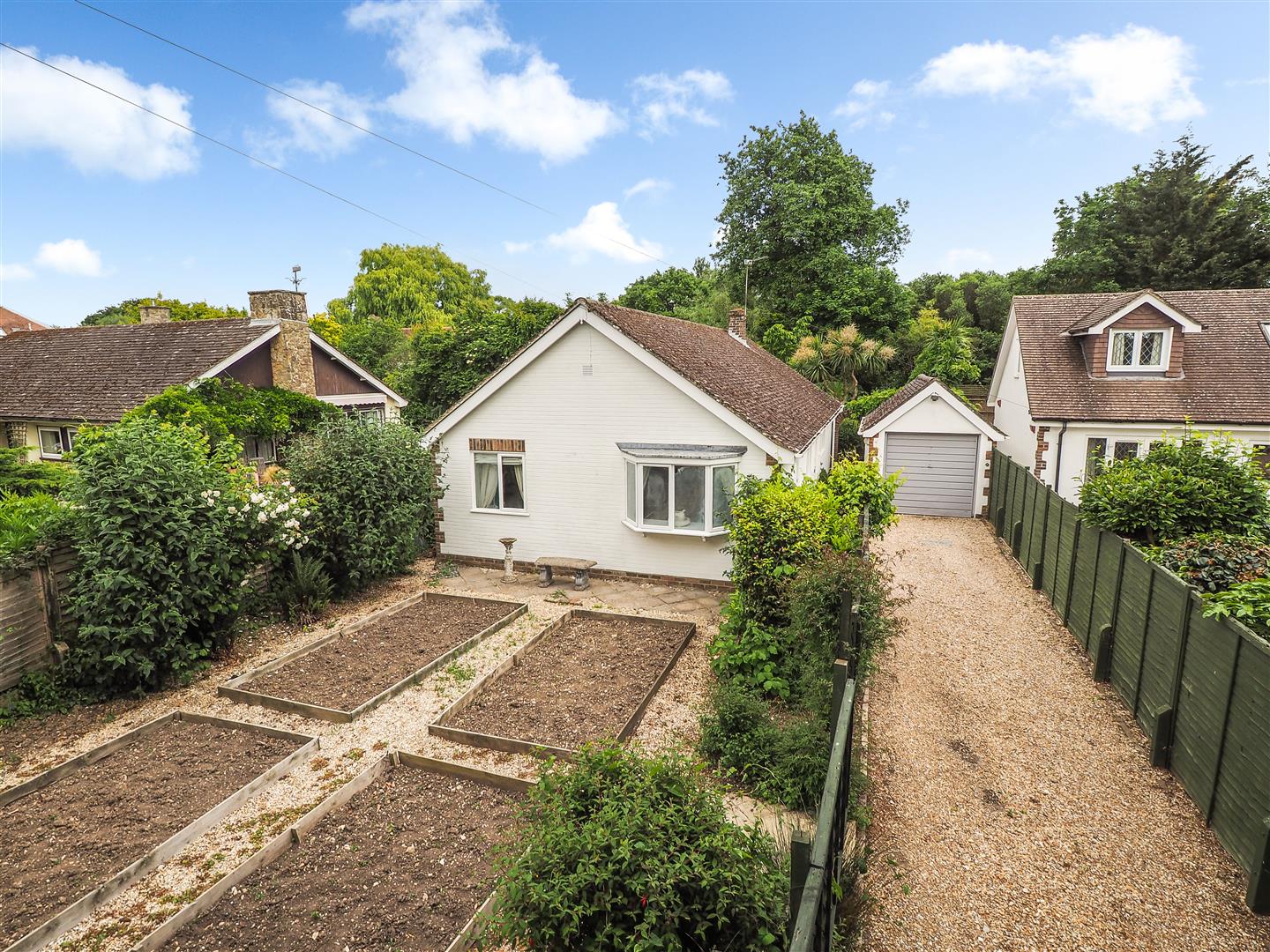 The front garden has four raised vegetable sections and there is a pretty trellis running along beside the driveway.