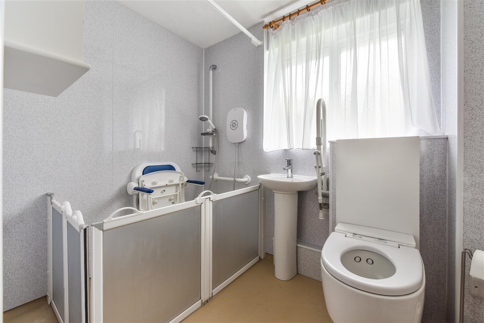 Shower/Wet Room: Formerly a bathroom, it now comprises a shower with fold up accessible shower seat. W.C. and wash hand basin. Chrome ladder style towel rail.