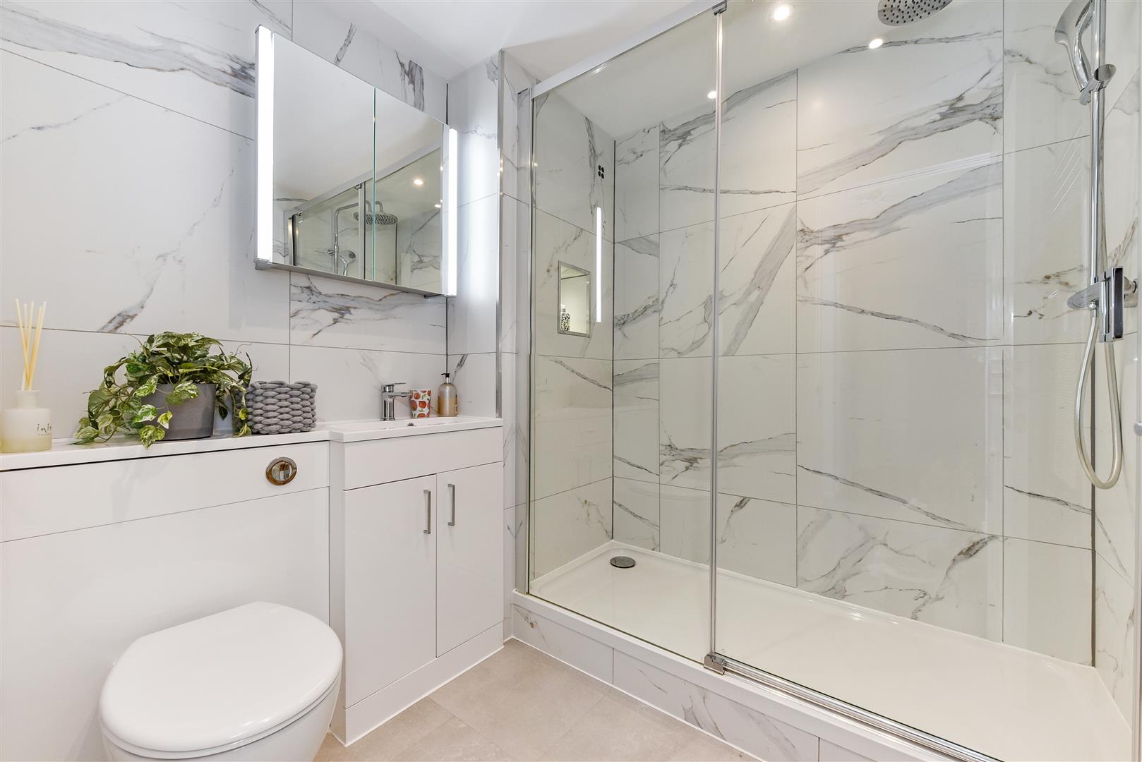 BATHROOM: Full width shower with sliding glass door, recessed w.c. and vanity unit with mirror cabinet above. Chrome, ladder style radiator.