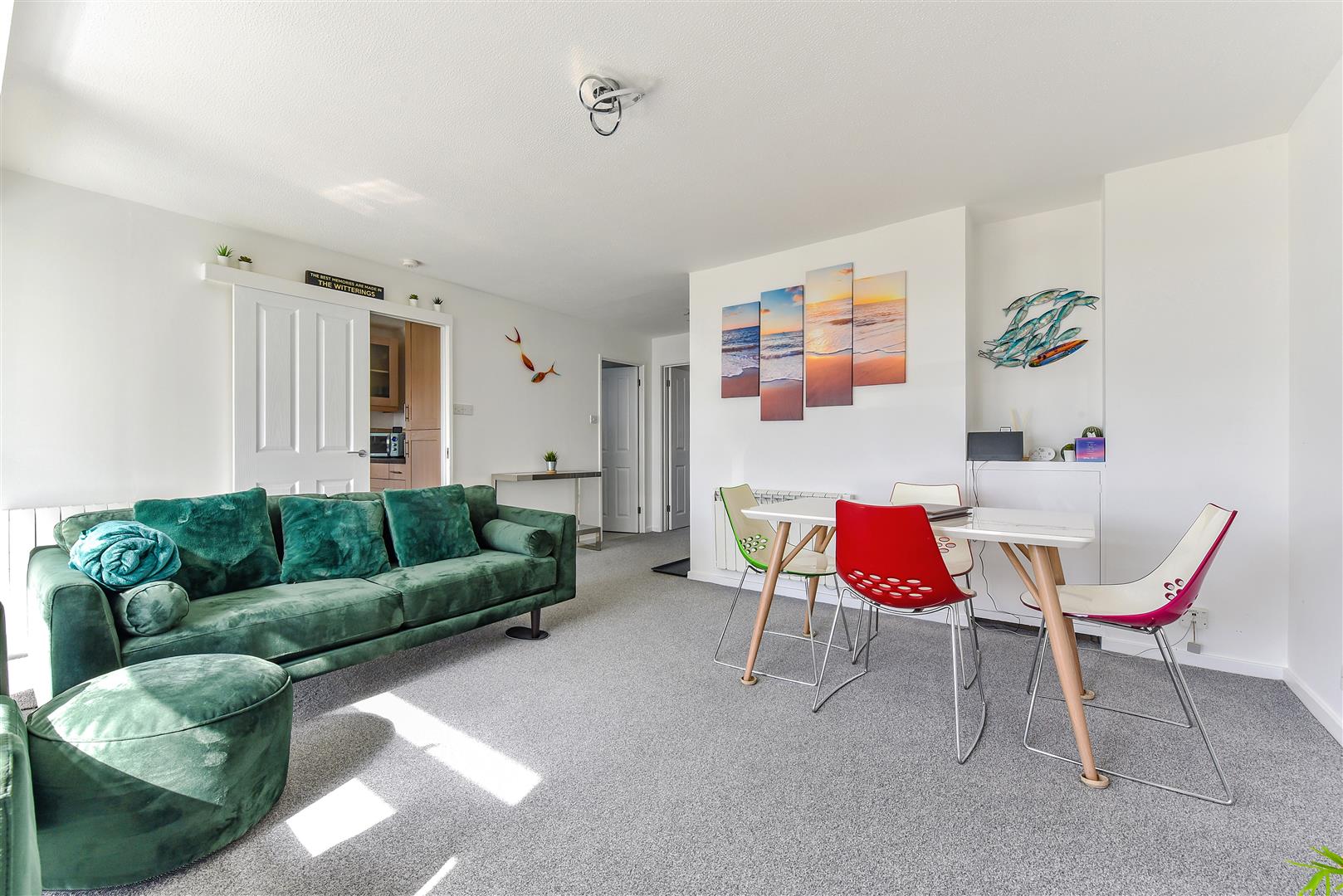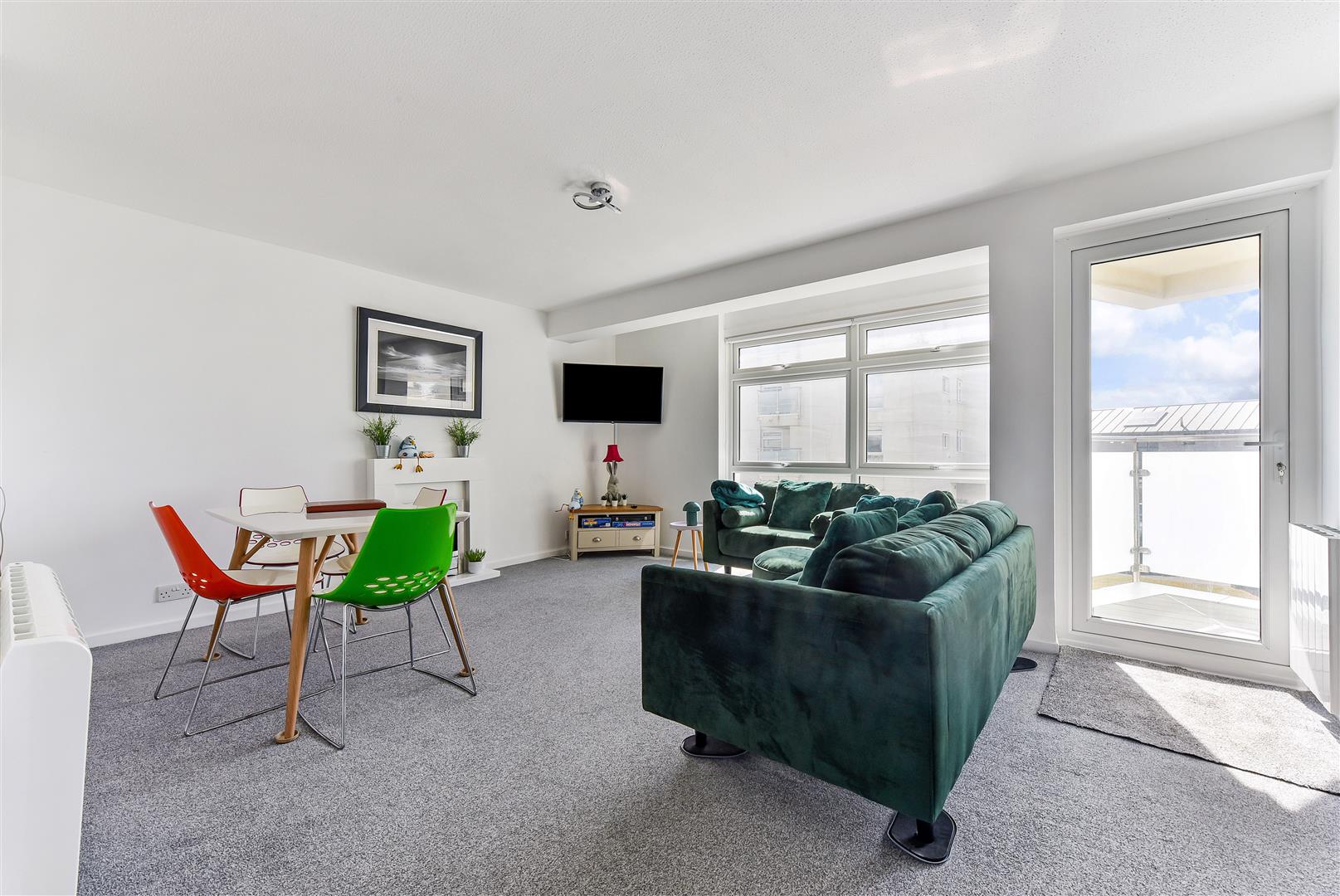 LIVING/DINING ROOM: (W) With sea views and enjoying a pleasant westerly aspect over the communal gardens. Two thermostatically controlled electric heaters. Access onto the west facing Sun Balcony.