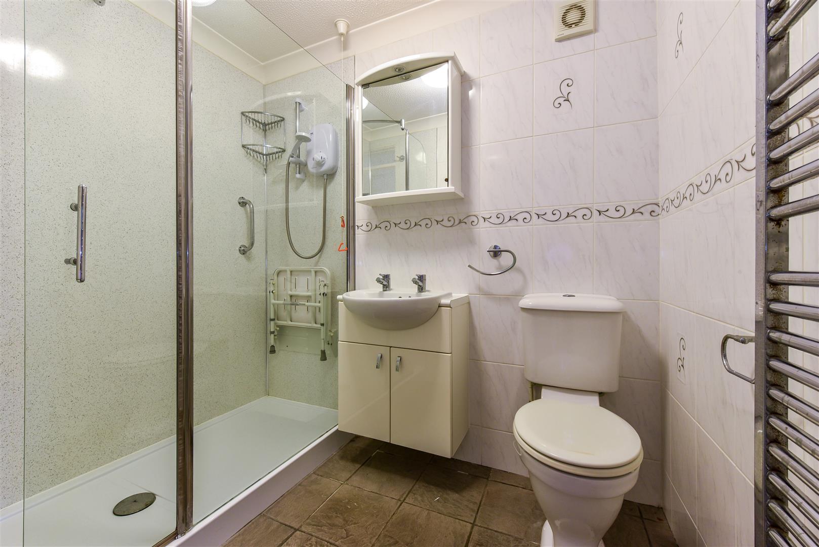 Shower Room: Full width, walk in shower with sliding glass door and 'Mira' Go Power electric shower, W.C. and wash hand basin. Tiled walls and ceramic tiled floor. Electric chrome ladder style towel rail. Cabinet with light and shaver point.