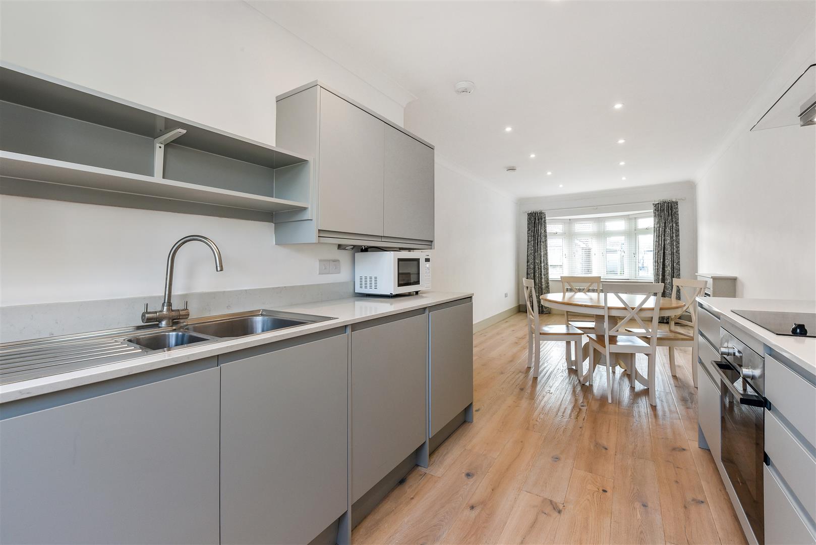 Open-plan Kitchen/Living/Dining Room: Bay window with venetian blinds, Electric radiator, Inset electric fire. Kitchen- A mix of wall mounted matte grey kitchen units and white marble effect work surfaces. Bosch ceramic hob with extractor hood, Bosch electric oven, Integrated dishwasher, integrated fridge/freezer, Stainless steel butler-style sink. Roof light and door leading to ramped access into rear garden.