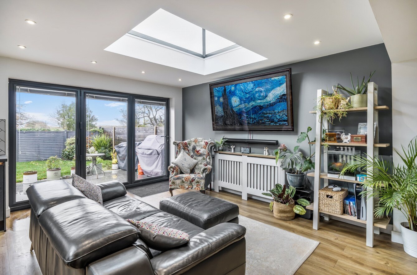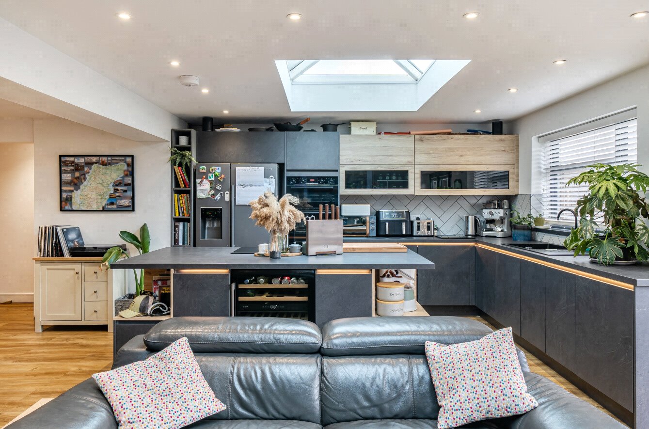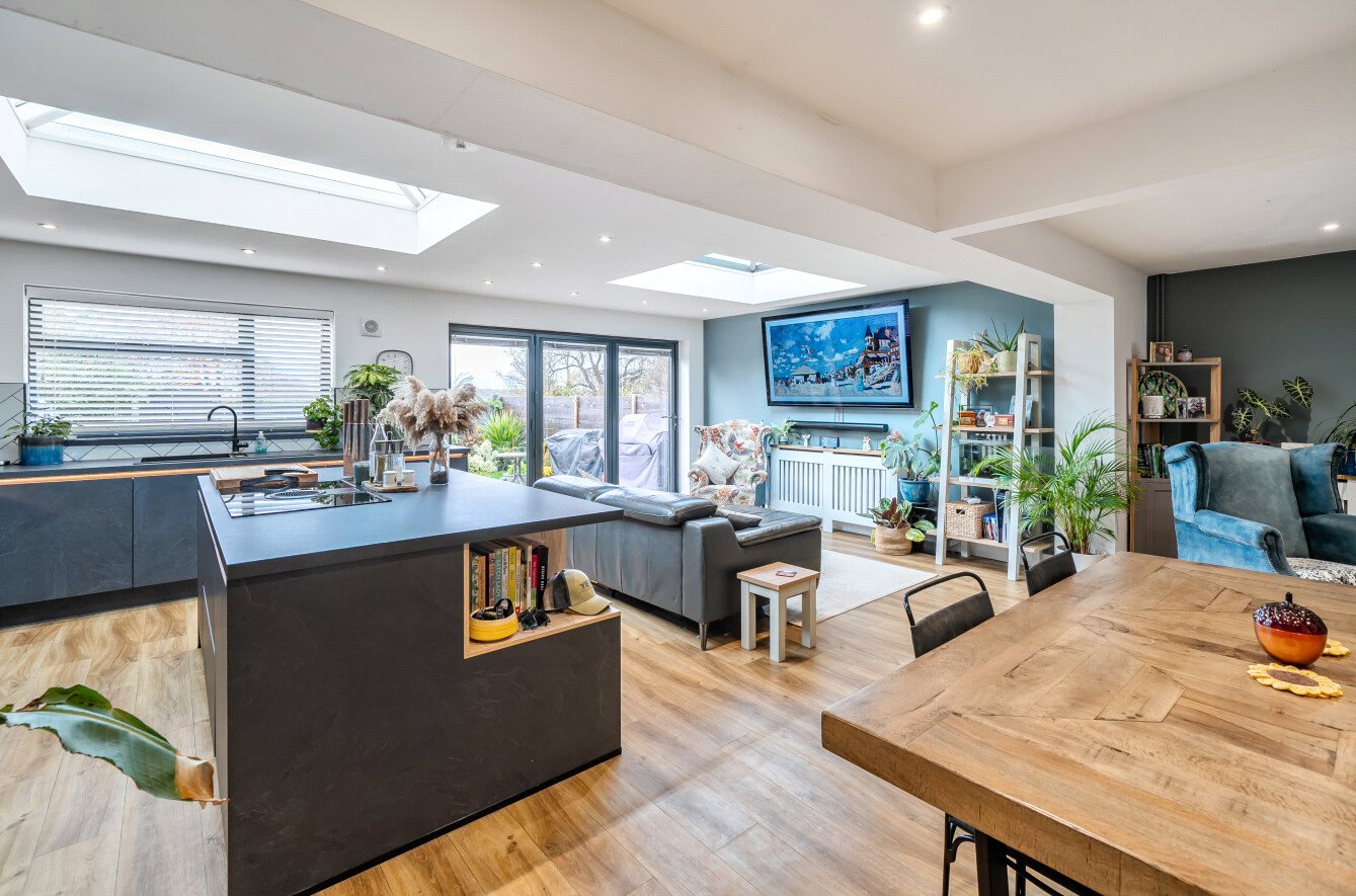 Kitchen/Diner Area 22'3" x 21'9" (6.78m x 6.63m). Comprehensively fitted with a bespoke modern kitchen with adjoining work top preparation surface with inset sink and drainer with mixer tap over complemented by tiled splash backs. Integrated oven with grill above and fitted dishwasher. Kitchen Island with induction hob and fitted extractor and fitted drinks cooler with storage below. Space for American style fridge/freezer, inset spotlights, two sky lights, radiators, uPVC double glazed window and uPVC double glazed bi-folding doors giving access to the rear garden. Built in storage cupboard.