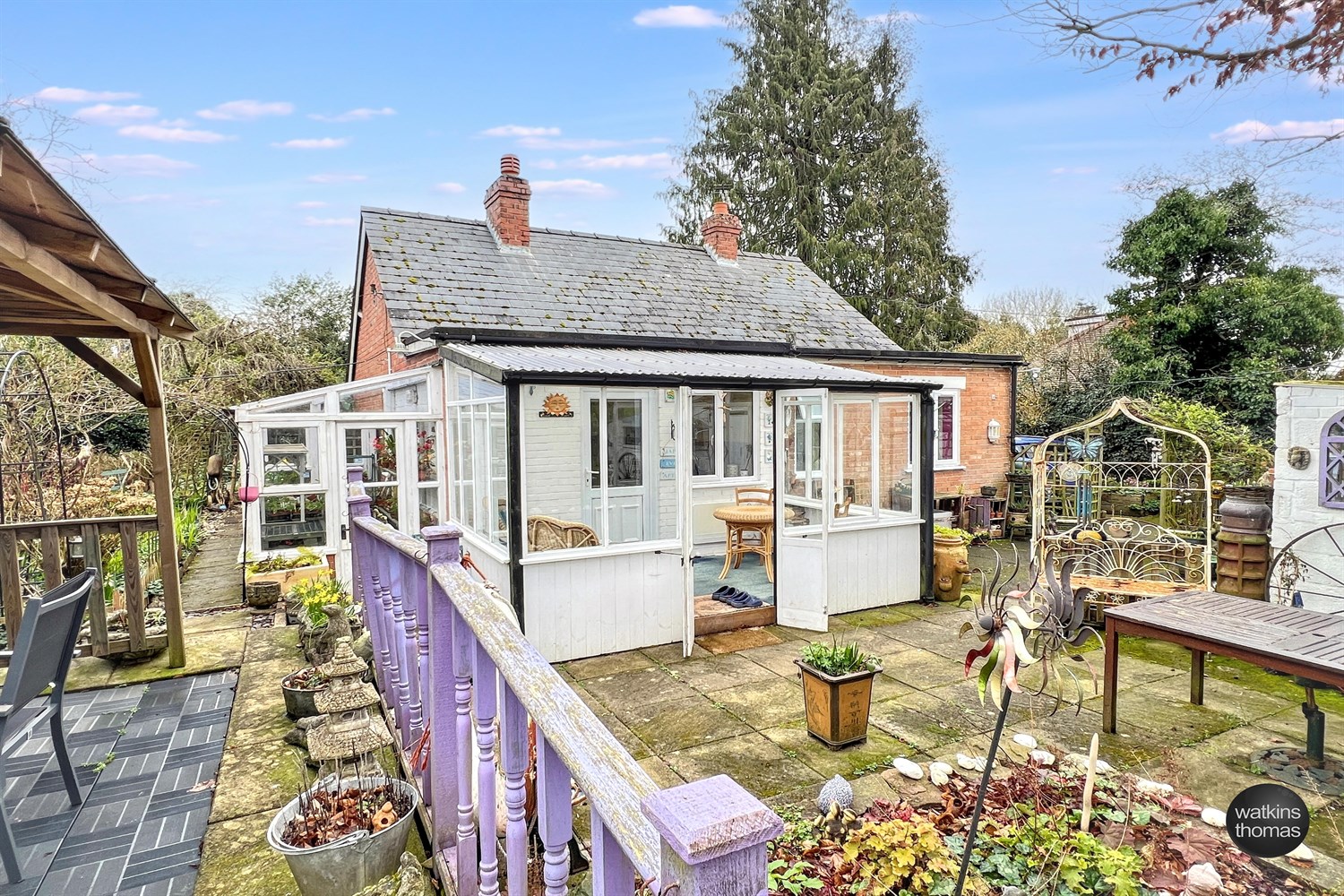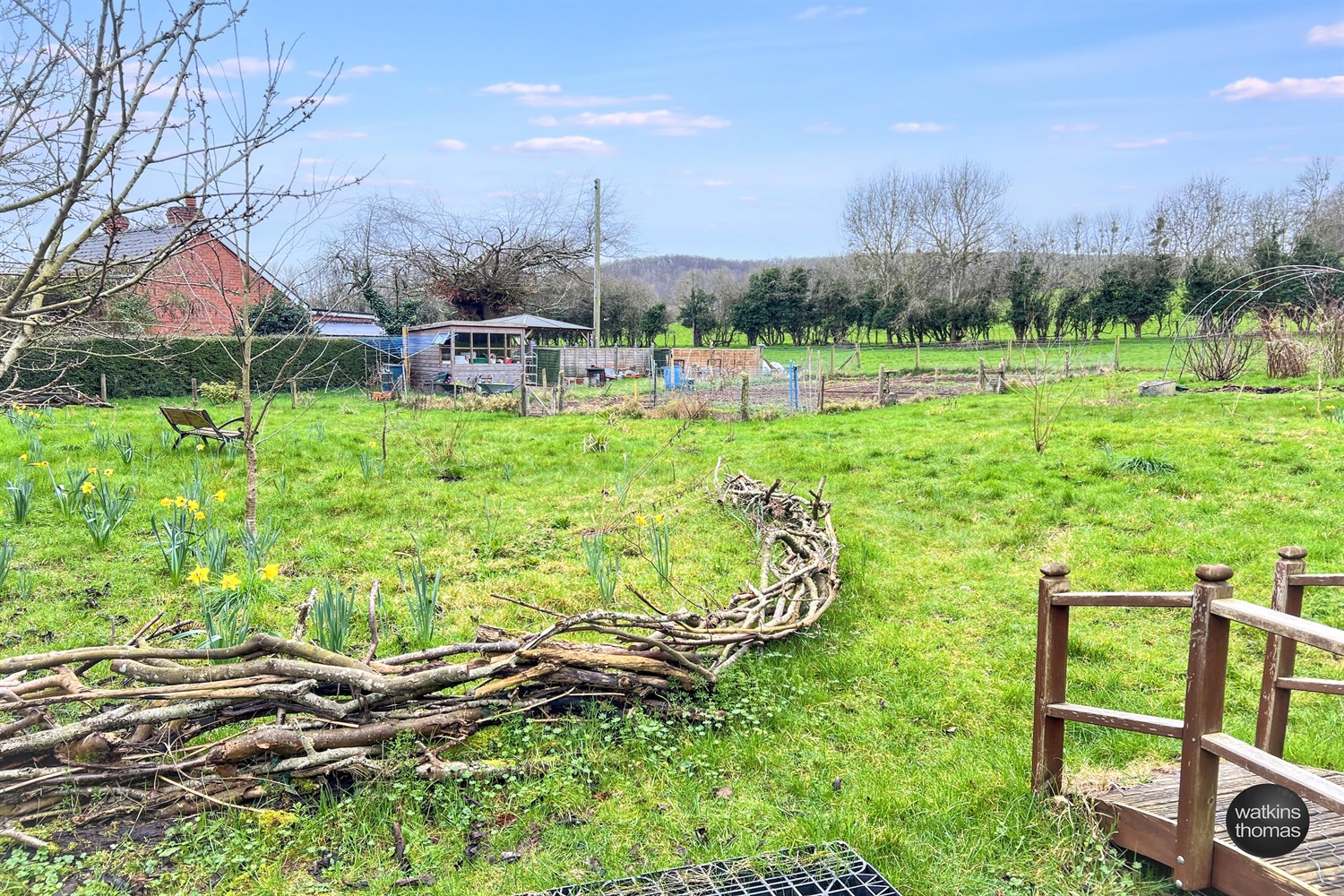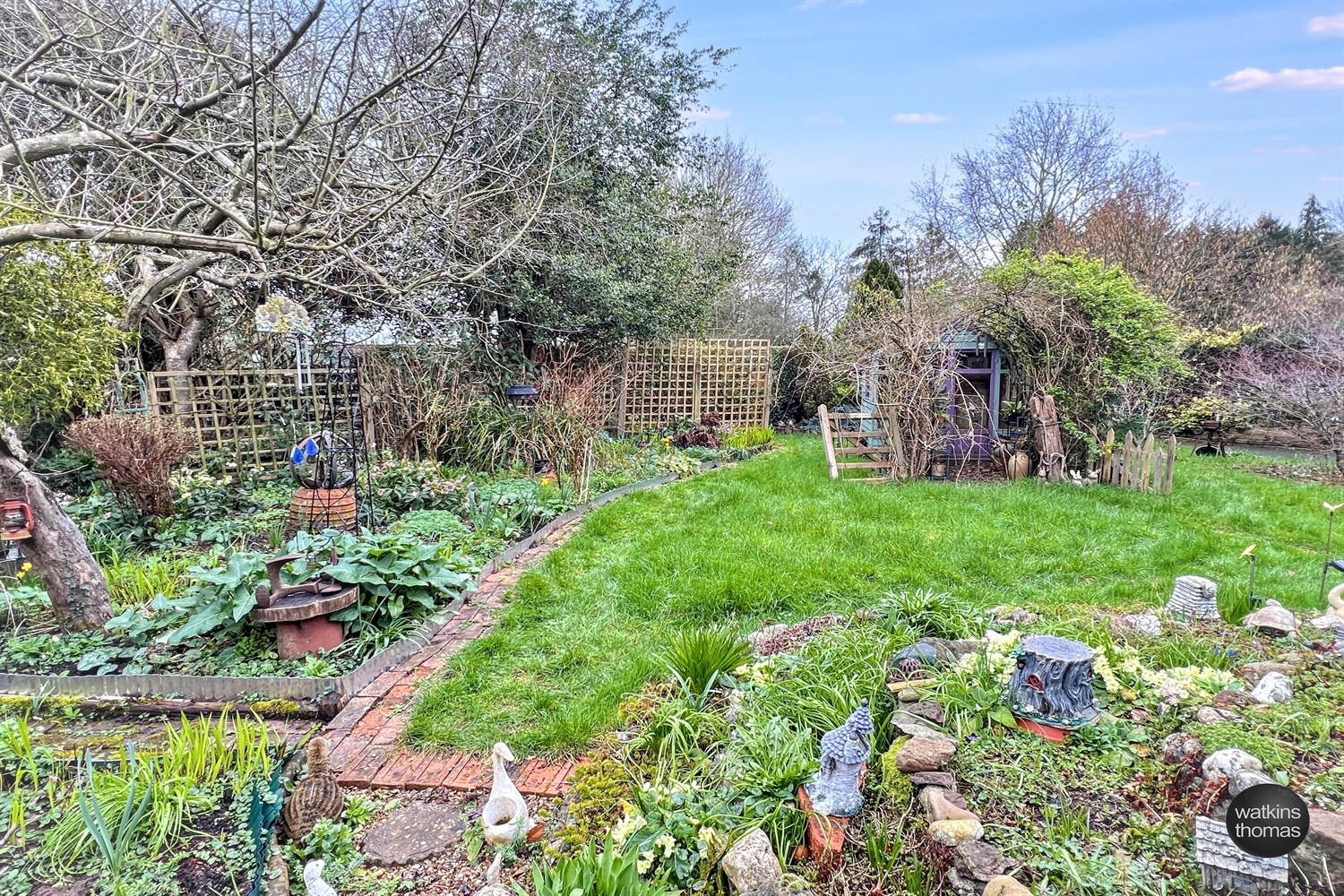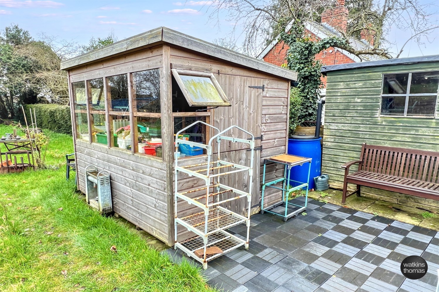 The property is approached from the A49 through a pair of wrought iron gates which leads to a driveway with turning area and the GARAGE STRUCTURE (15' 7 by 10' 9) with additional storage space. To the right hand side of the driveway at the front of the property, there is a lawned garden area with individual shrubs and planted rockery borders featuring spring bulbs and mature trees. There is also a single garden room structure approached through an archway with climbing plants over. Access can also be achieved at the right hand side of the residence. From the right of the residence there is a stepping stone pathway and planted beds and borders divided by brick pathways and the hard landscaped rear garden area, comprising a paved patio area with stone borders surrounding, there is a mature crowned copper beech tree and seating under a PERGOLA (9' 4 by 9' 4). The property also has the benefit of a lean to greenhouse (10' 3 by 5' 5) and two out houses which are approximately 10' 4 by 4' 9 and 6' by 6'. From the side garden area, there is an opening to an additional garden area which is approximately a 1/4 of an acre and is laid to lawn with vegetable plots. Within this area there is a stream with bridge over, a garden store 8' by 6', which has a part glazed elevation. At the rear of the property there is the drainage system and a further garden store (5' 9 by 7' 10).