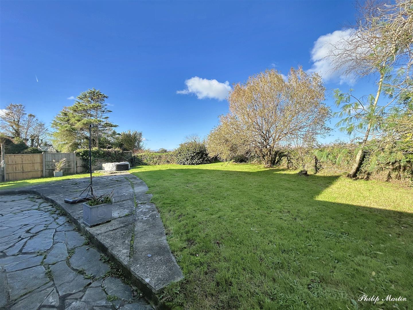 The front garden is mostly laid to lawn surrounded by mature shrubs and conifer hedging and planted borders, along with an apple tree. To the rear there is a large lawn area and a patio. The lawn is surrounded by cornish hedge looking onto open farmland with rural open views. A pathway leads around to the front of the property.