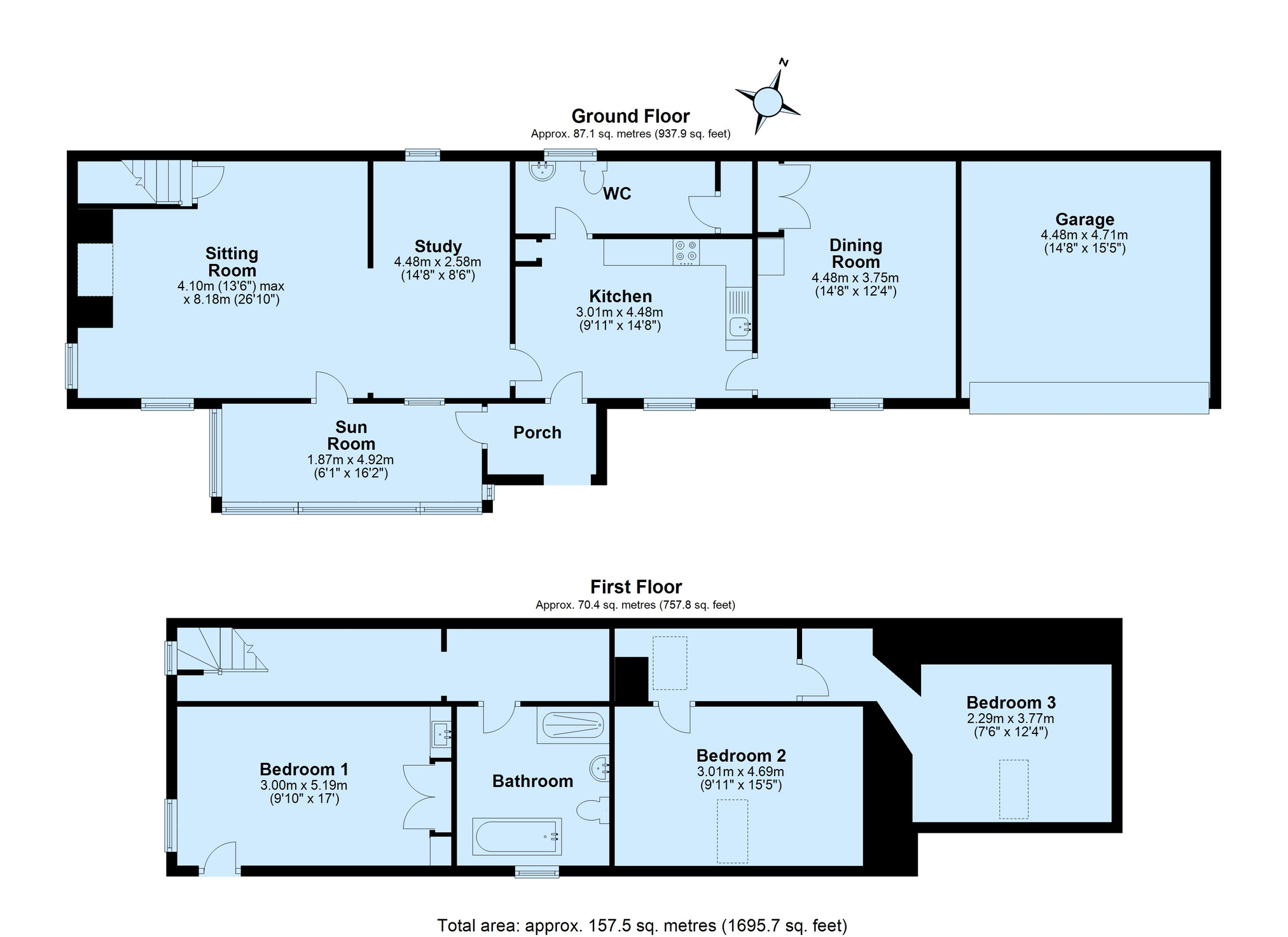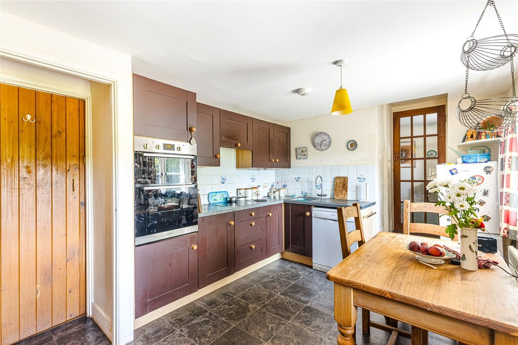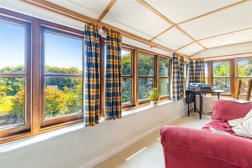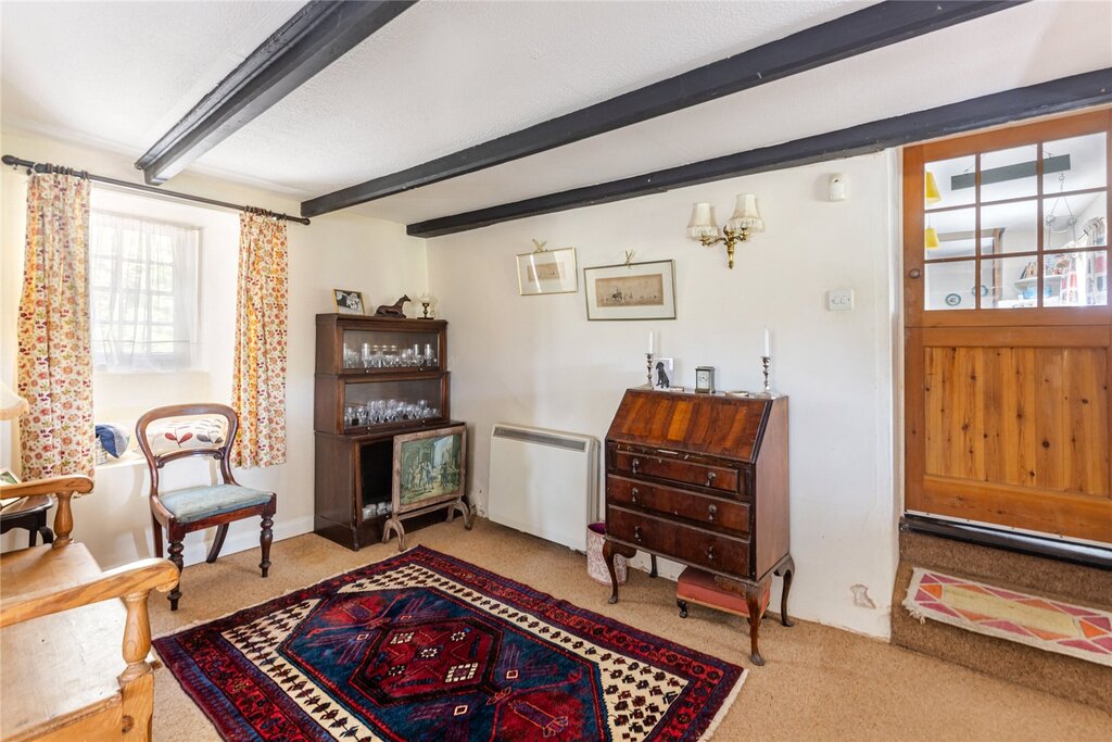 The entrance porch leads into a characterful sitting/dining room, featuring a stone fireplace with a wood burning stove, beamed ceilings, and a staircase leading to the first floor. A window at the front overlooks the garden, while a rear window with a window seat adds to the cottage’s charm. The sunroom, with its double glazed hardwood construction, enjoys views of the garden and has direct access outside.
