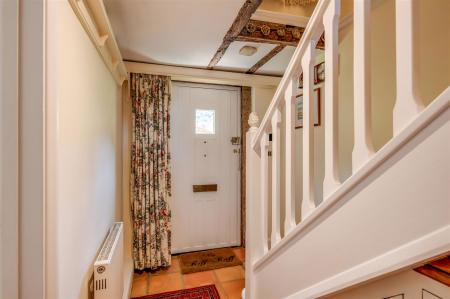 Terracotta tiled floor. Staircase to first floor. Exposed beams. Radiator. Storage cupboards.